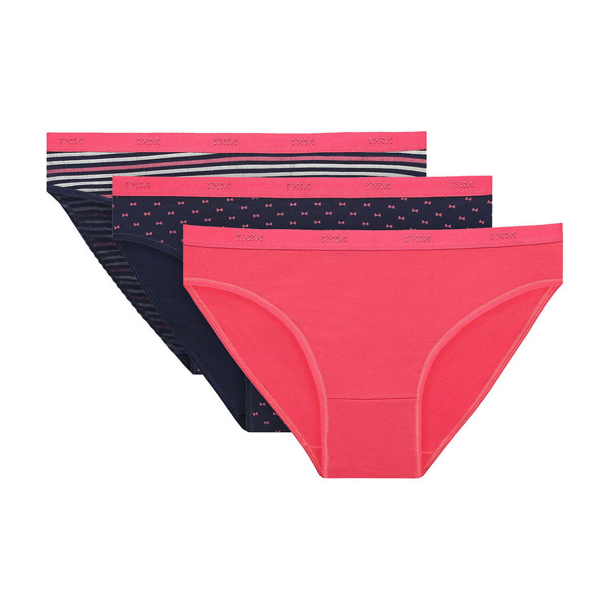 Набор из трех трусиков разных цветов. Нежный хлопок и мягкий комфортный пояс с логотипом "Dim". Плоская эластичная отделка. Комфорт в течение всего дня. Прекрасный подарок для себя и своих близких.