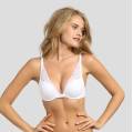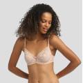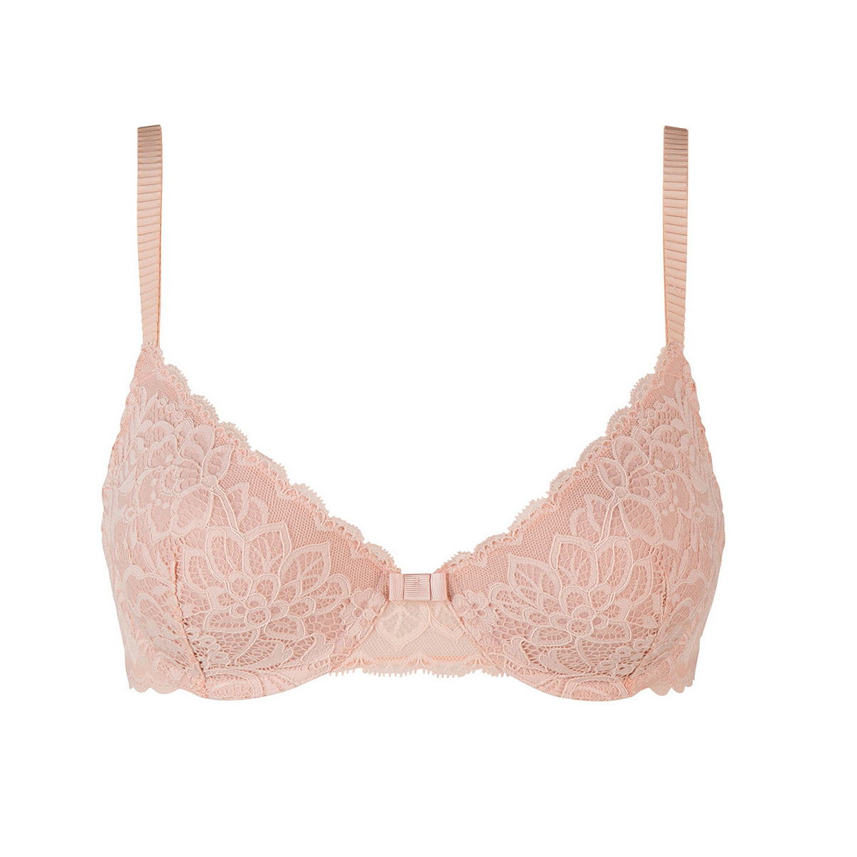 Бюстгальтер с формованной слегка уплотненной формой чашки. Чашки бюстгальтера покрыты плоским кружевом с цветочным орнаментом. Плиссерованные бретели регулируются. Область декольте дополнена декоративными "зубчиками".