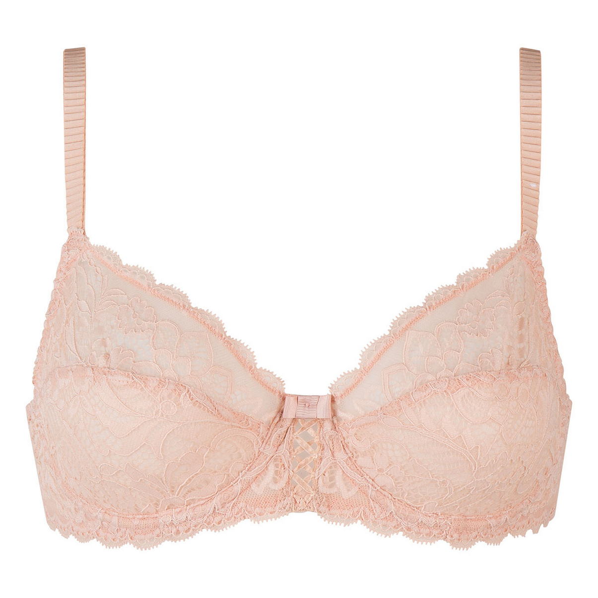 Бюстгальтер классический на косточках, с мягкой закрытой формой чашек, на косточках. Чашки выполнены из плоского кружева с цветочныи орнаментом. Нижняя часть чашек дублирована для придания необходимой поддержки. Центральная панель декорирована шнуровкой. Плиссерованные бретели регулируются. Область декольте дополнена декоративными "зубчиками".