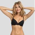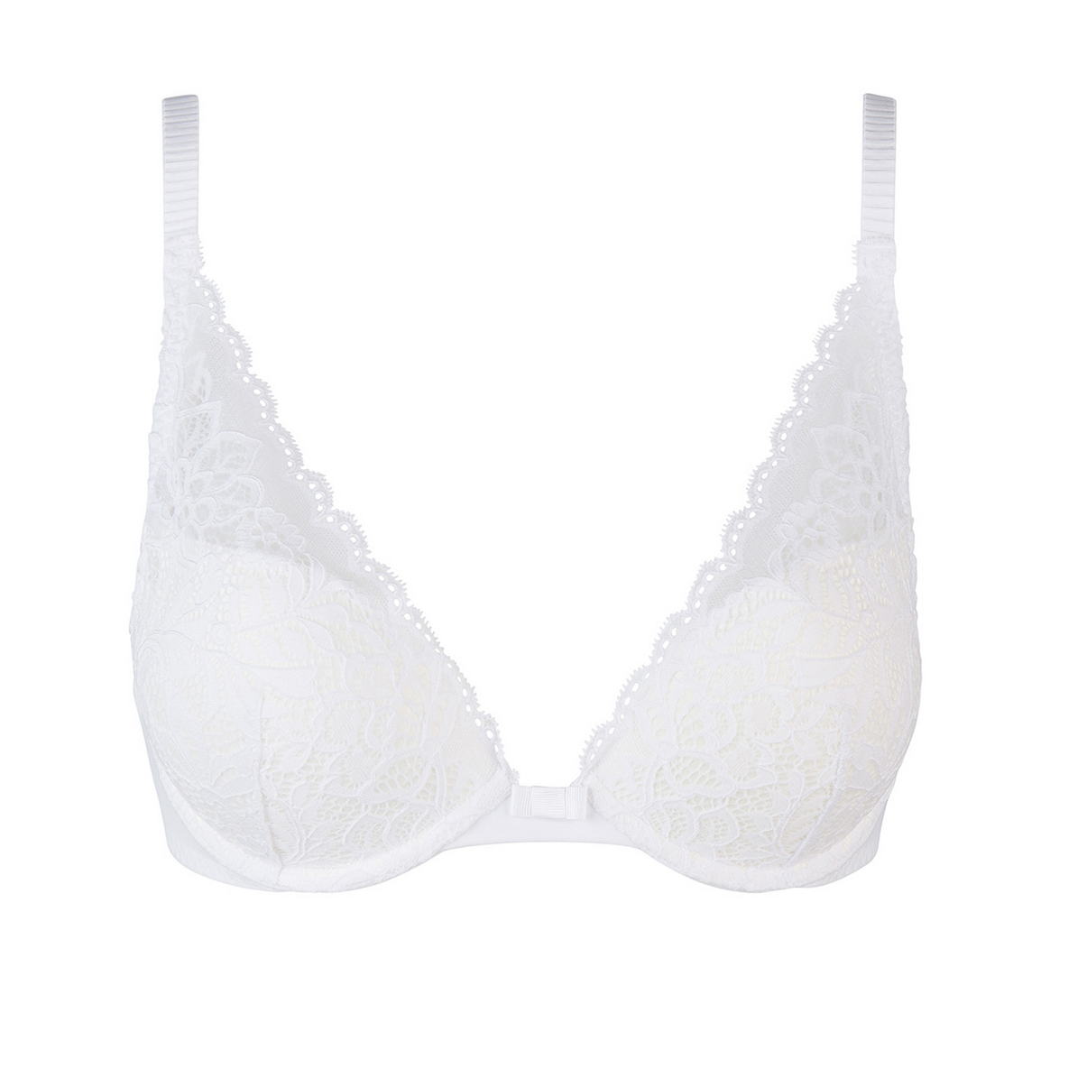 Бюстгальтер - пуш ап c уплотненной формой чашек с прослойкой из мусса, на косточках. Чашки бюстгальтера покрыты плоским кружевом с цветочным орнаментом. Плиссерованные бретели регулируются. Область декольте дополнена декоративными "зубчиками". На центральной панели разместился атласный бант.