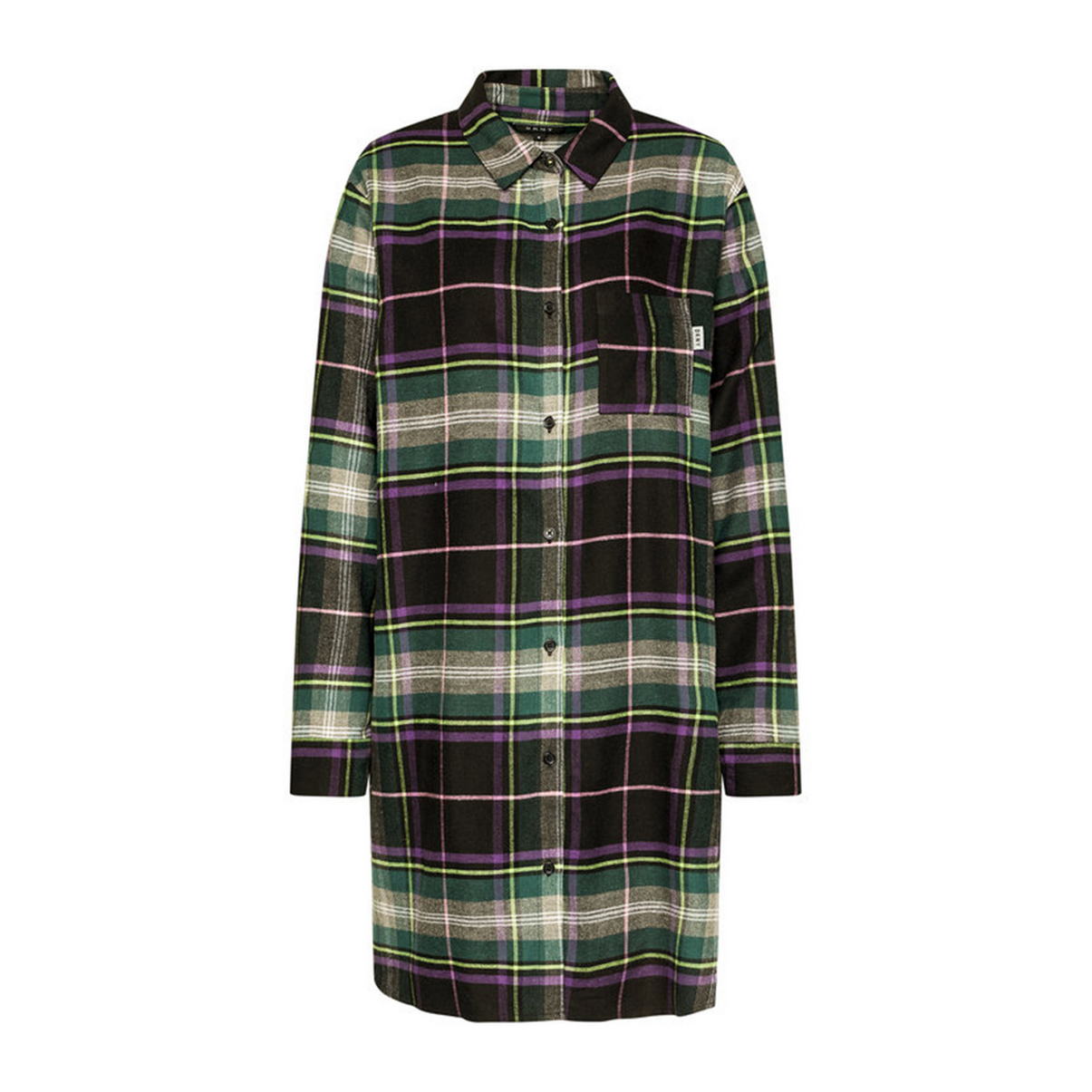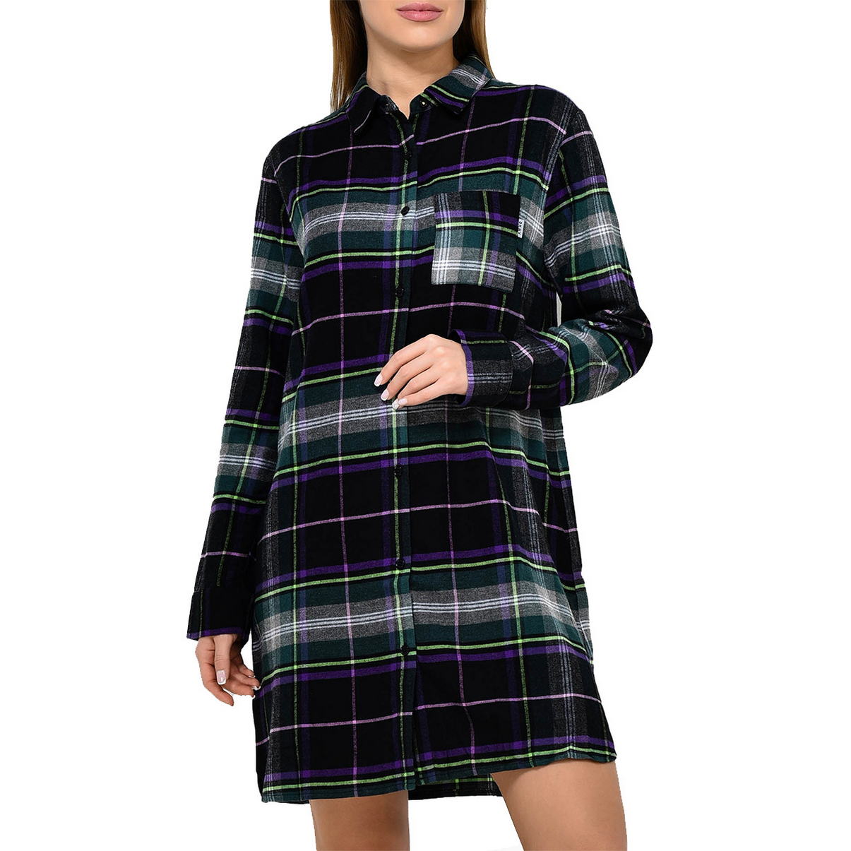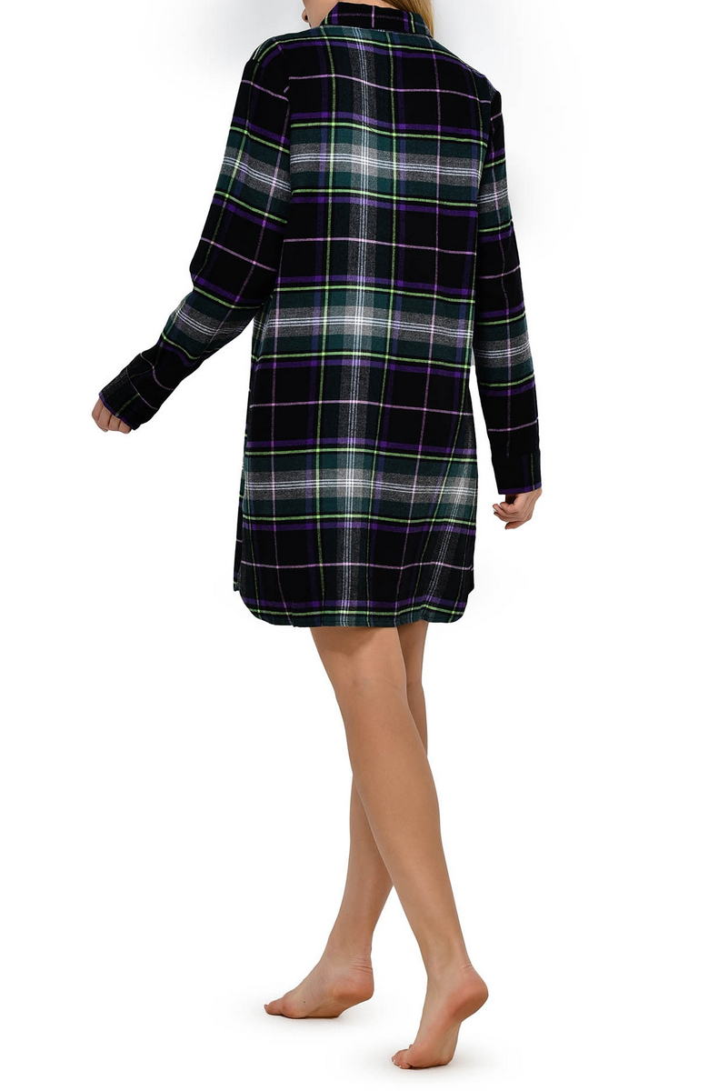 Удлиненная рубашка для сна или для дома выполнена в мужском стиле, на пуговицах, с воротником и нагрудным карманом. По бокам разрезы.