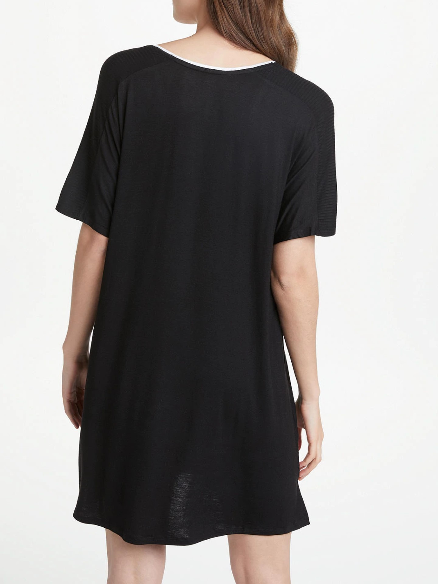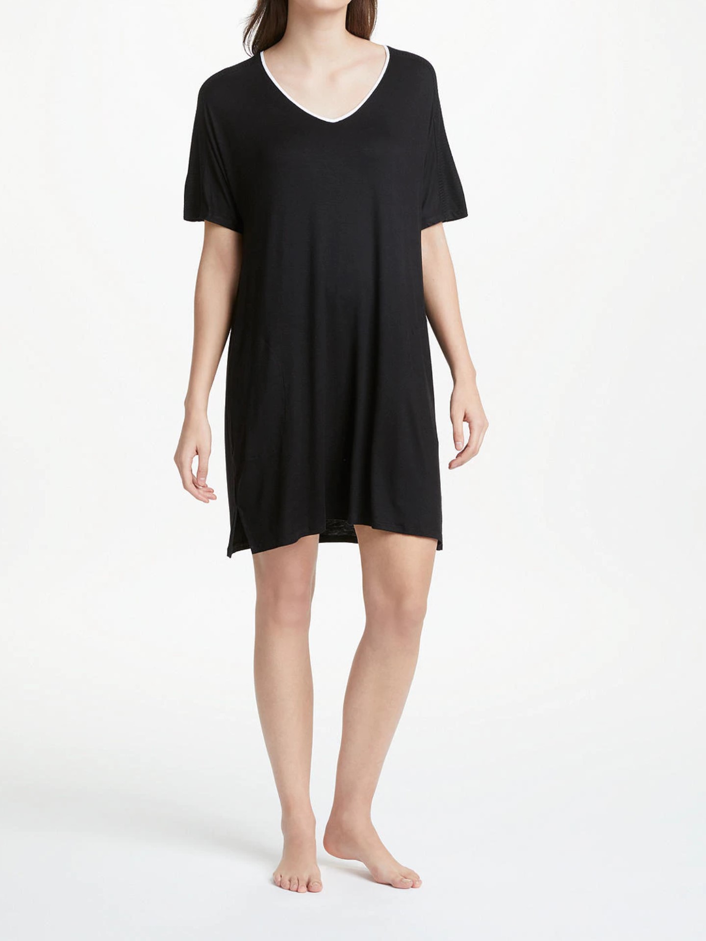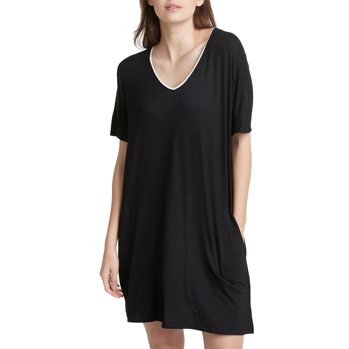 Короткая туника свободного кроя с короткими рукавами с боковыми карманами. Достаточно глубокий V-образный вырез.