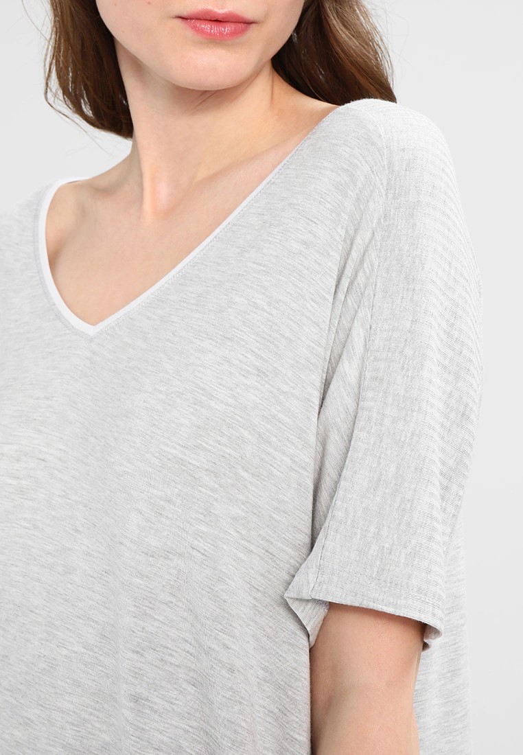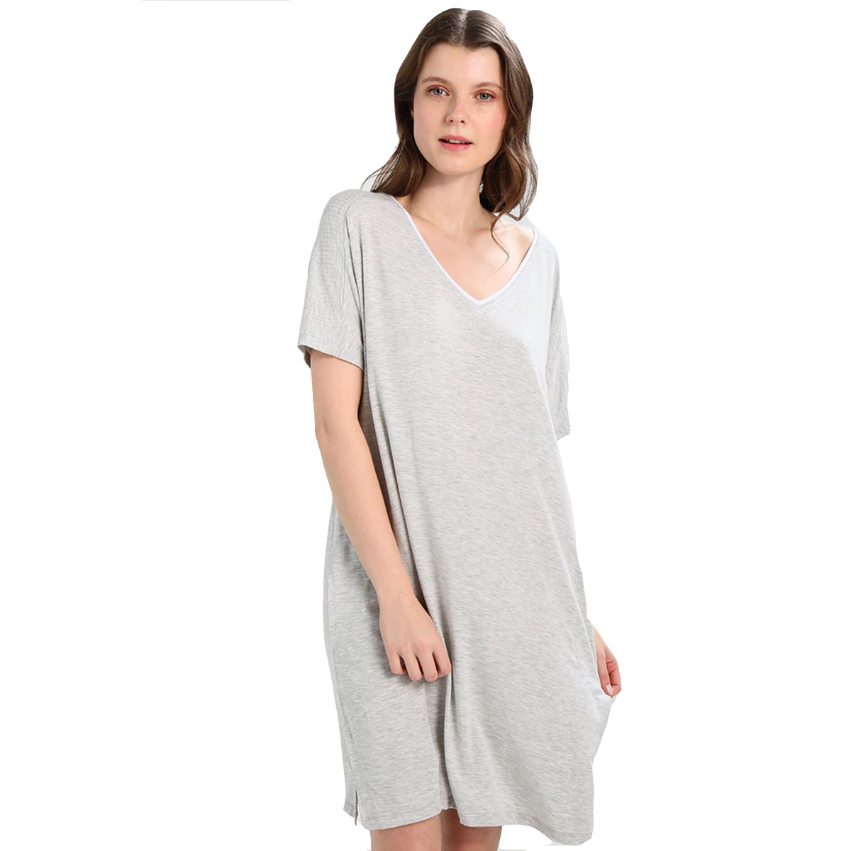 Короткая туника свободного кроя с короткими рукавами с боковыми карманами. Достаточно глубокий V-образный вырез.