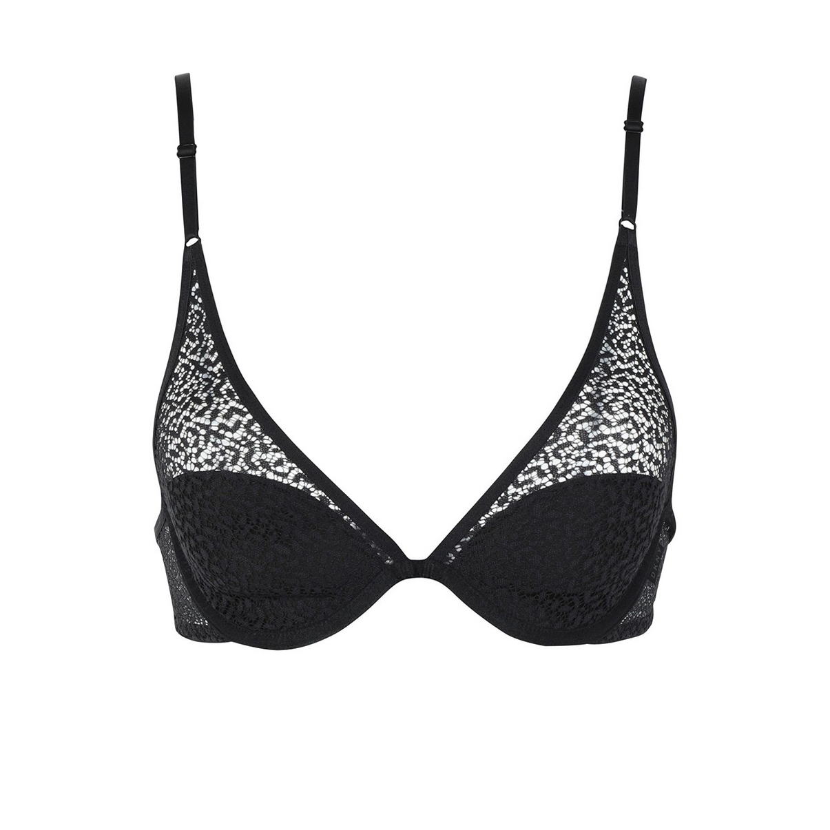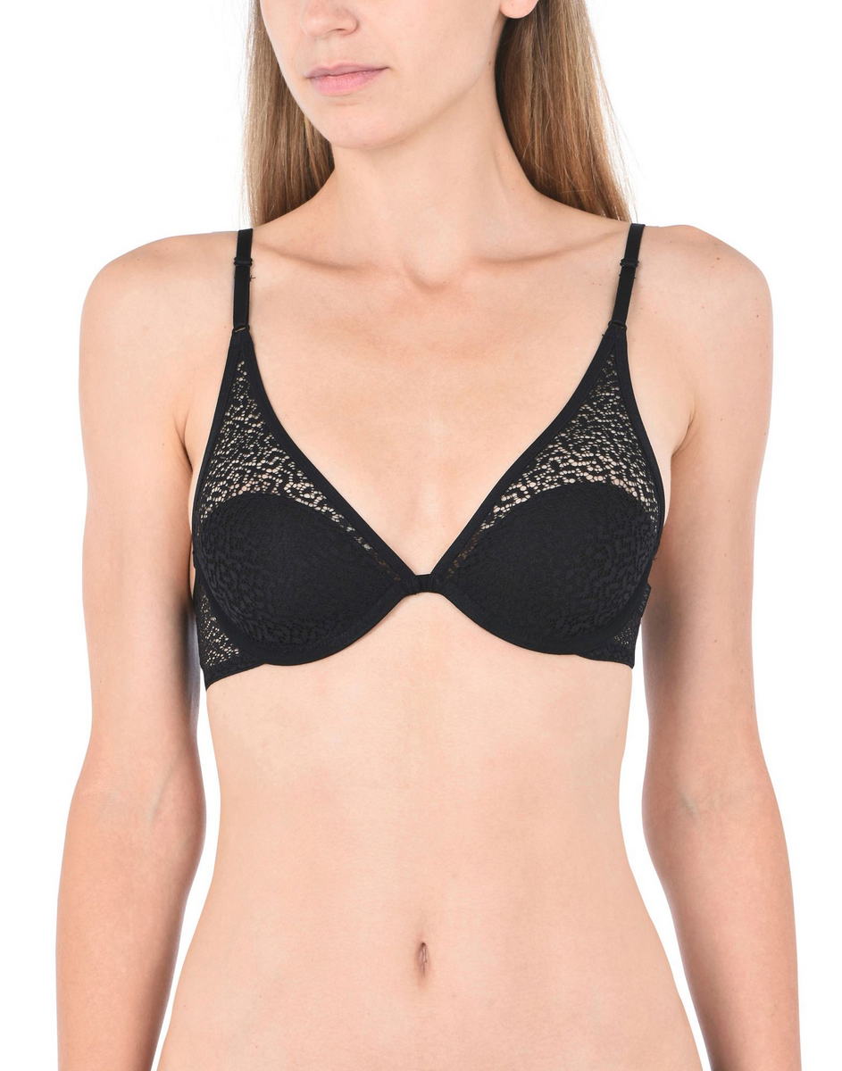 Бюстгальтер-треугольник со слегка уплотненной формой чашек. На косточках. Чашки покрыты кружевом. Узкая центральная панель. Глубокое декольте. Боковые и задняя панели по-нижнему краю отделаны эластичной тесьмой. Регулирующиеся бретели.
