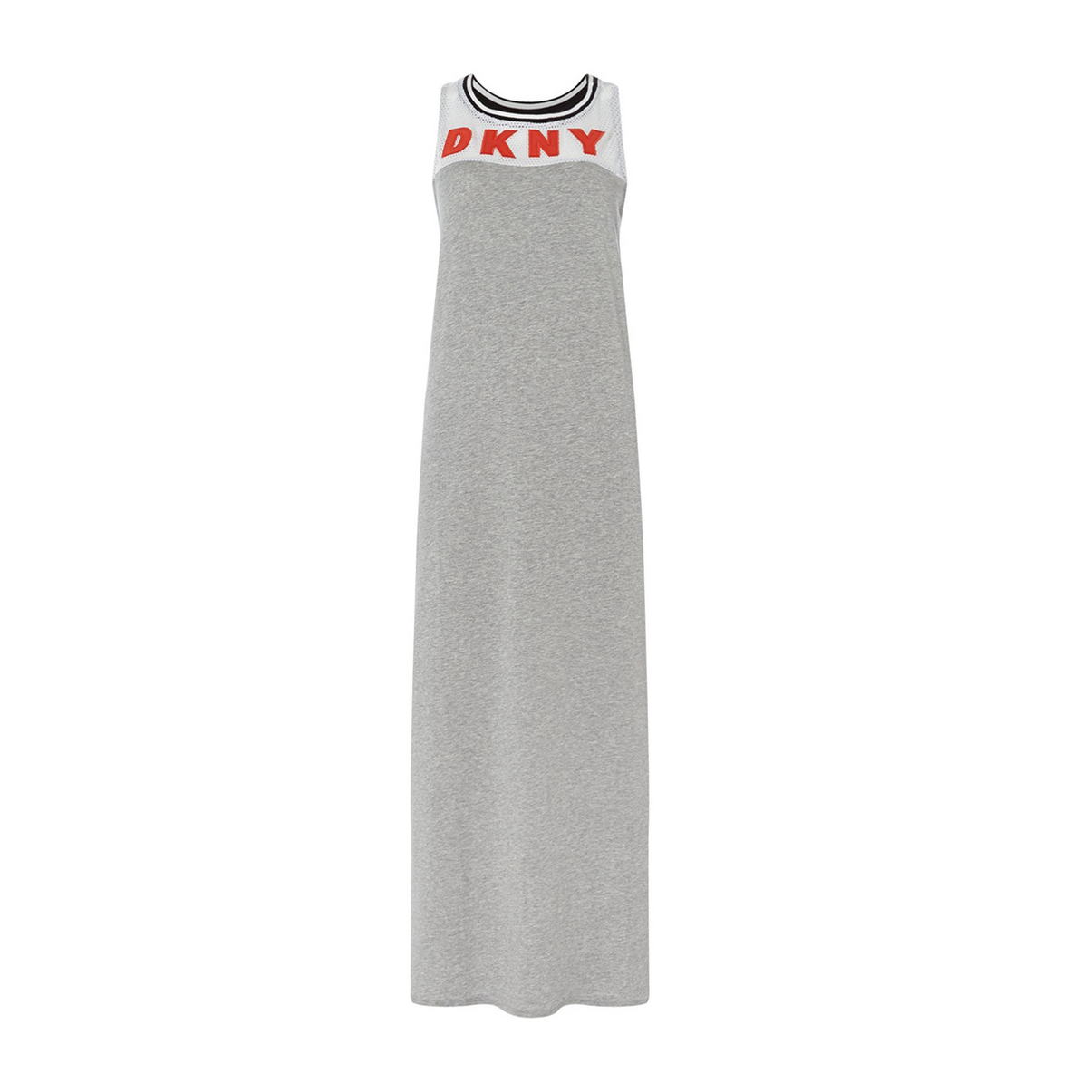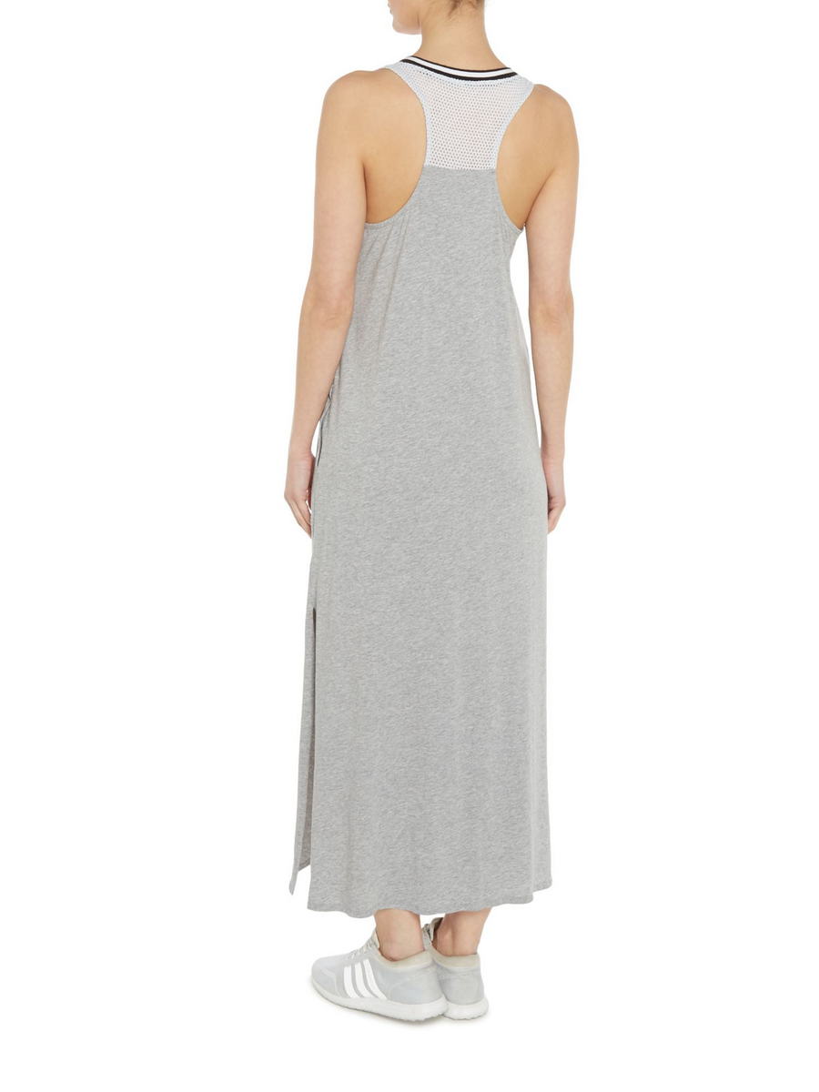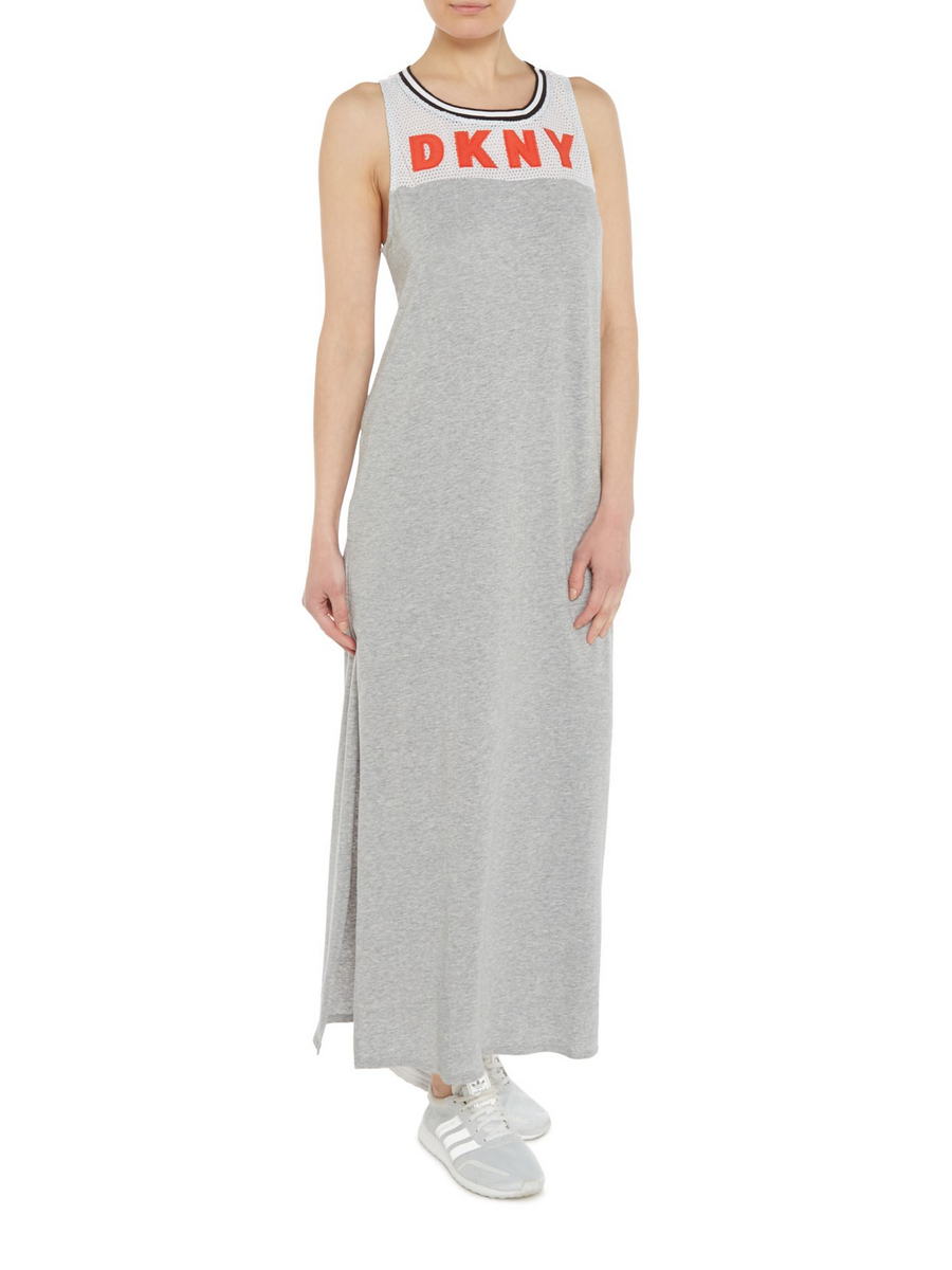 Длинное платье (127 см) с оригинальным дизайном: на груди сетчатая вставка с логотипом. "Американская" спинка. По бокам разрезы. Выполнено из приятного натурального материала.