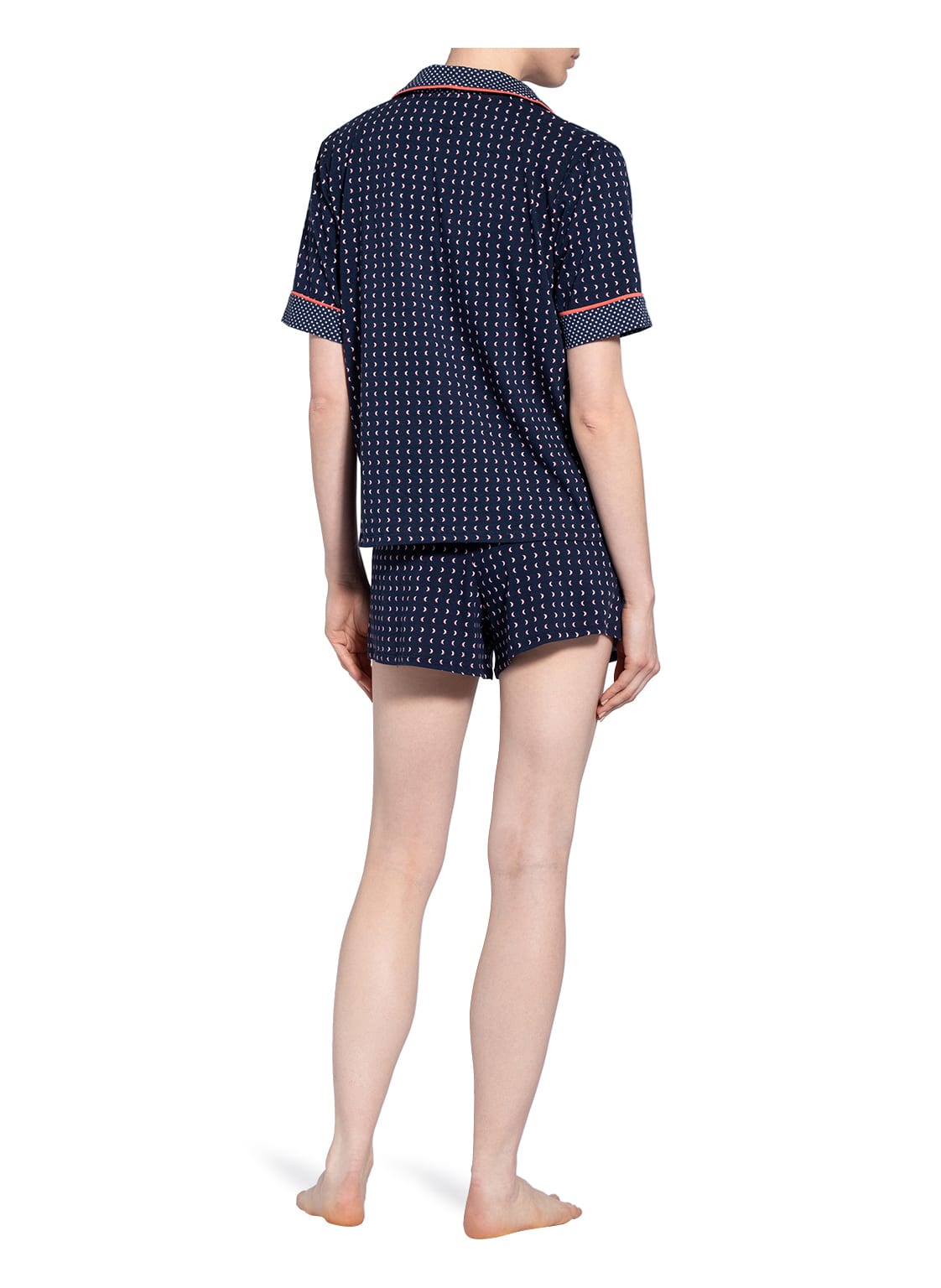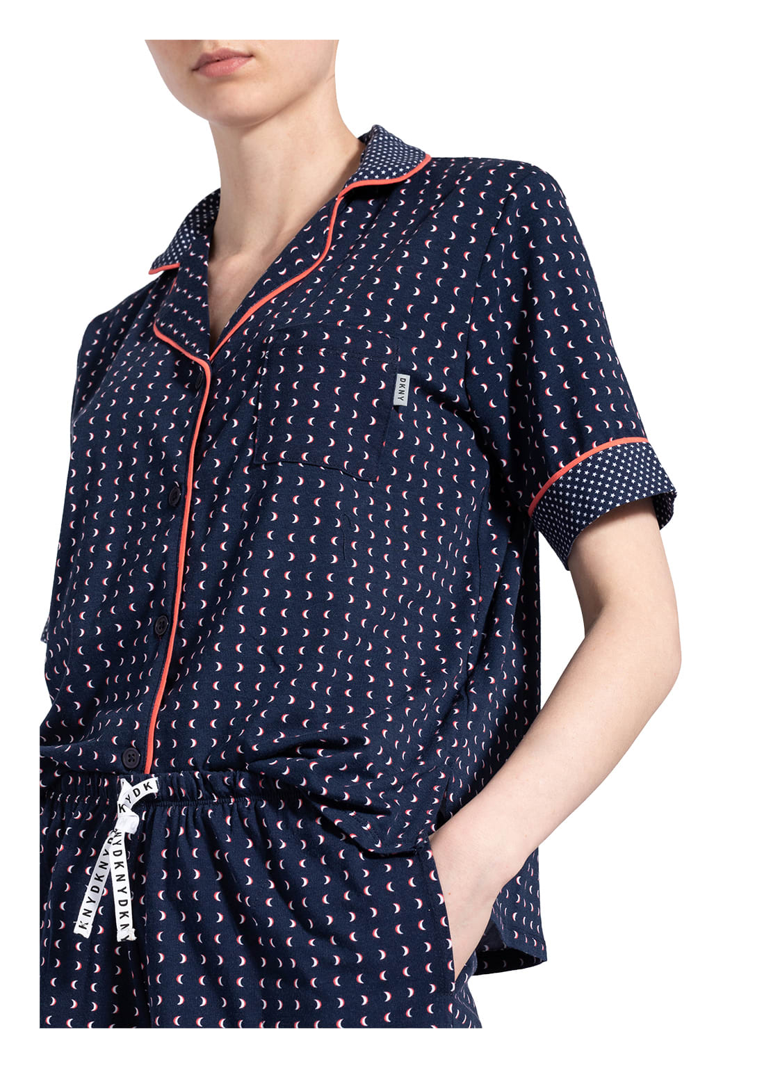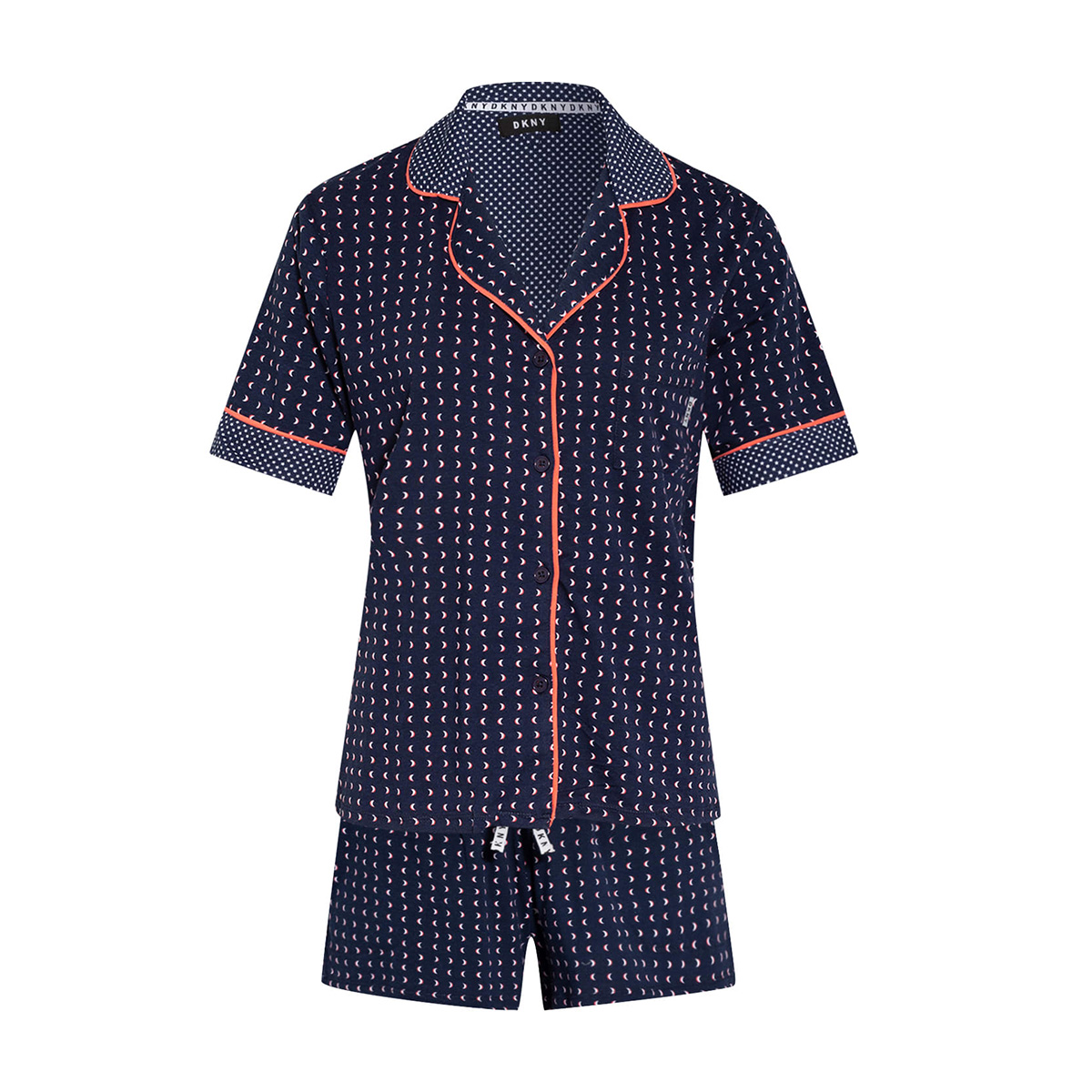 Пижама: жакет+шорты. Жакет - свободного кроя с короткими рукавами на пуговицах, с воротничком. Небольшой нагрудный карман с логотипом. Контрастная отделка на воротничке и рукавах. Короткие шорты - свободного кроя на завязках с логотипом и боковыми карманами.