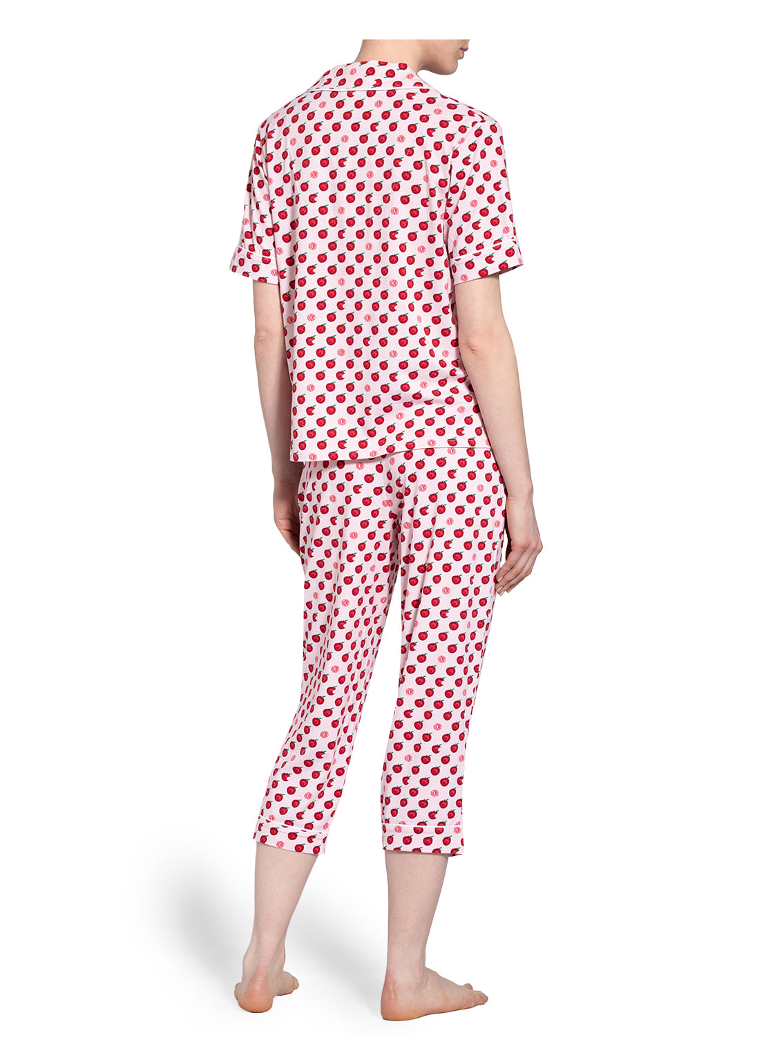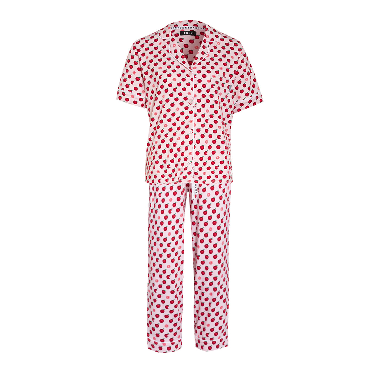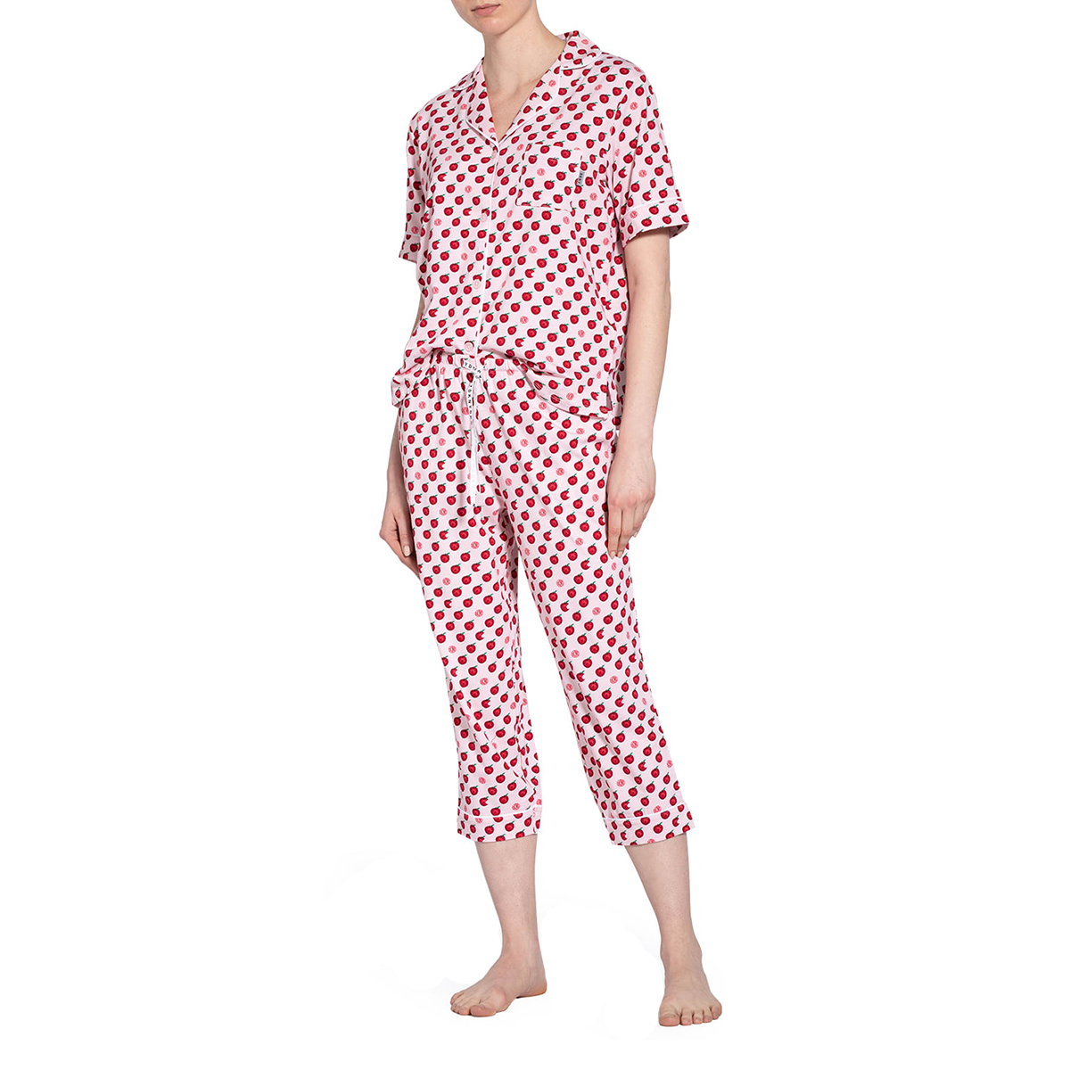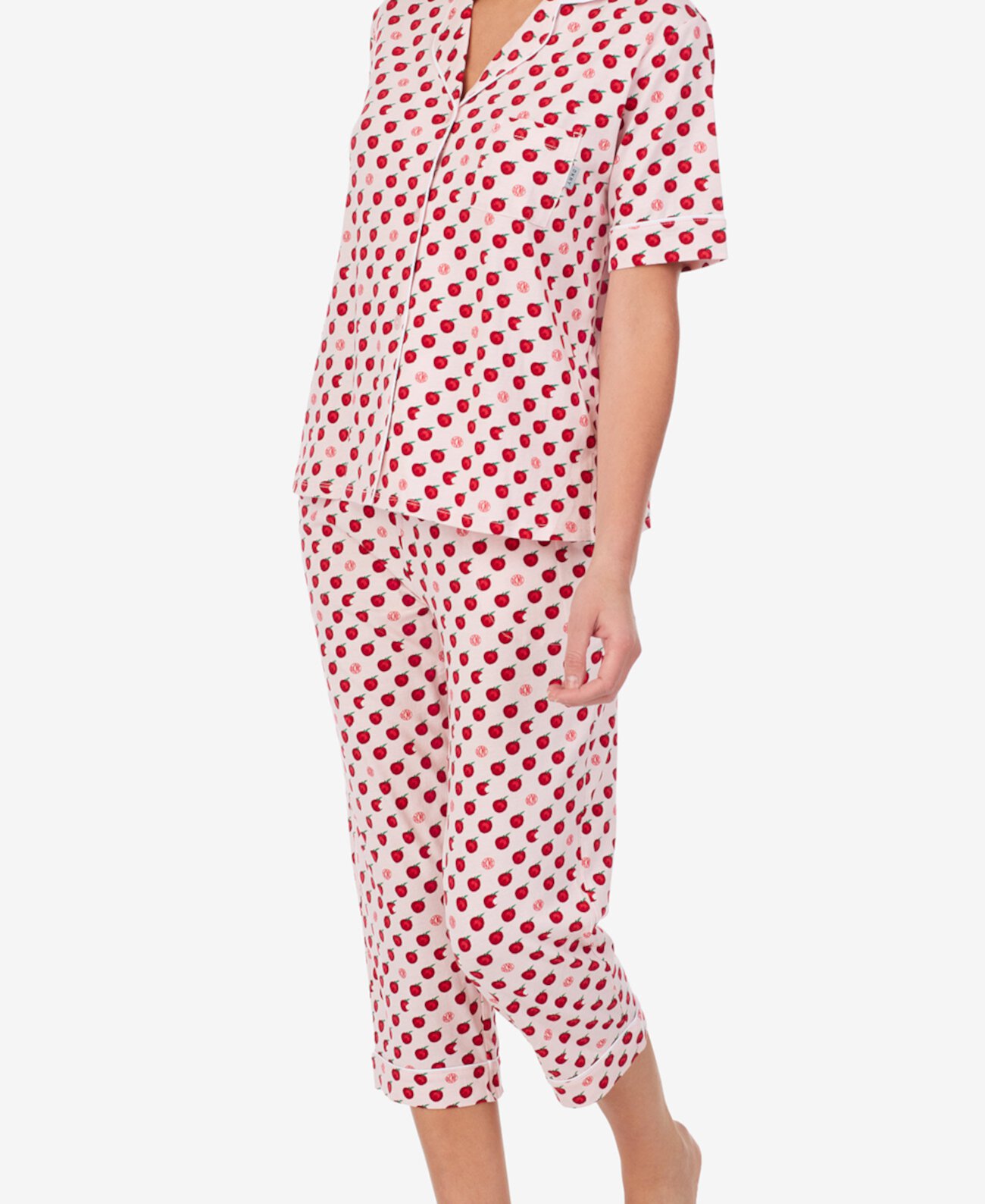 Пижама: жакет+капри. Жакет - свободного кроя с короткими рукавами на пуговицах, с воротничком. Небольшой нагрудный карман с логотипом. Капри - свободного кроя на завязках с логотипом и боковыми карманами. Контрастная отделка нижнего края.