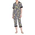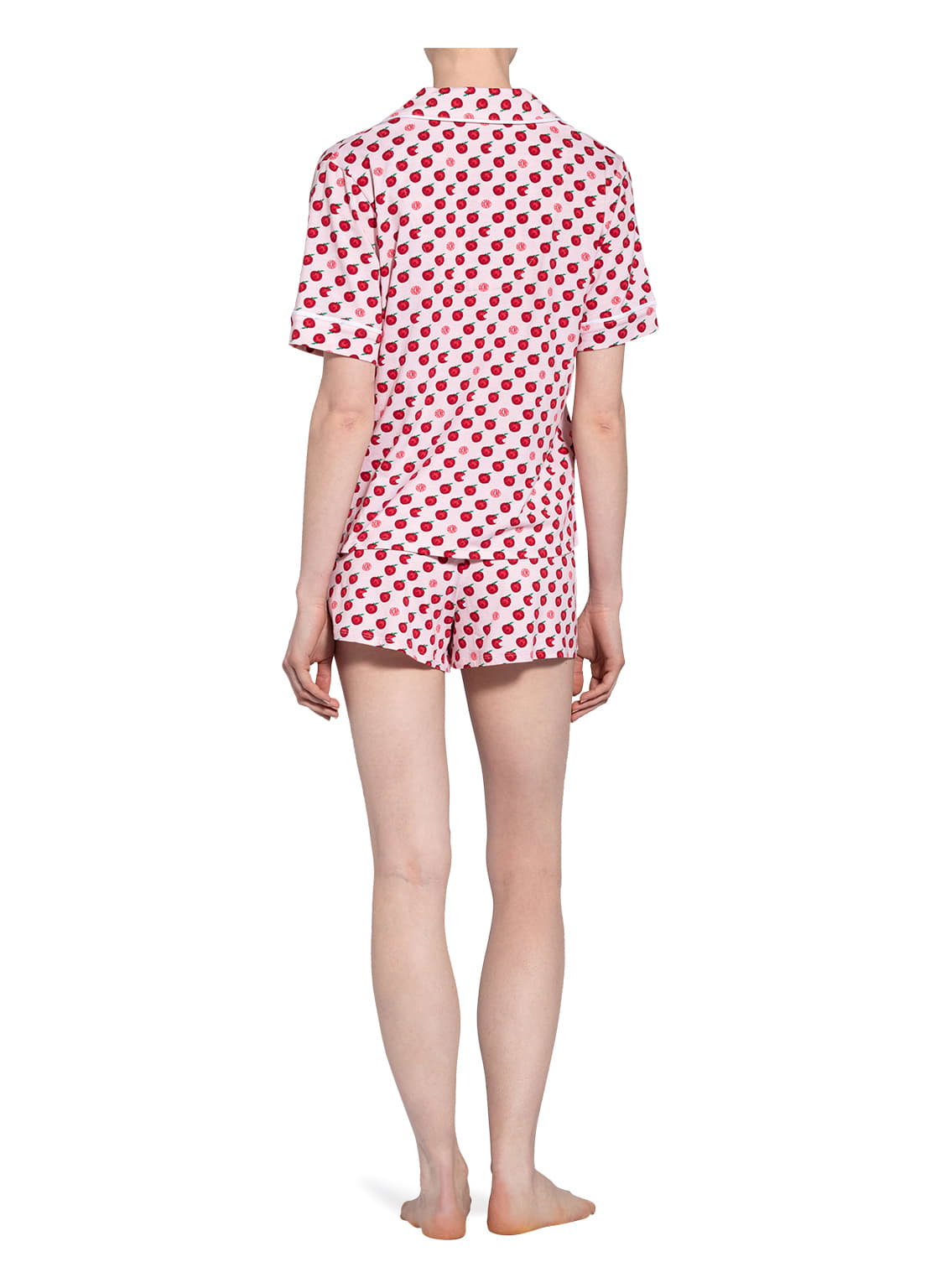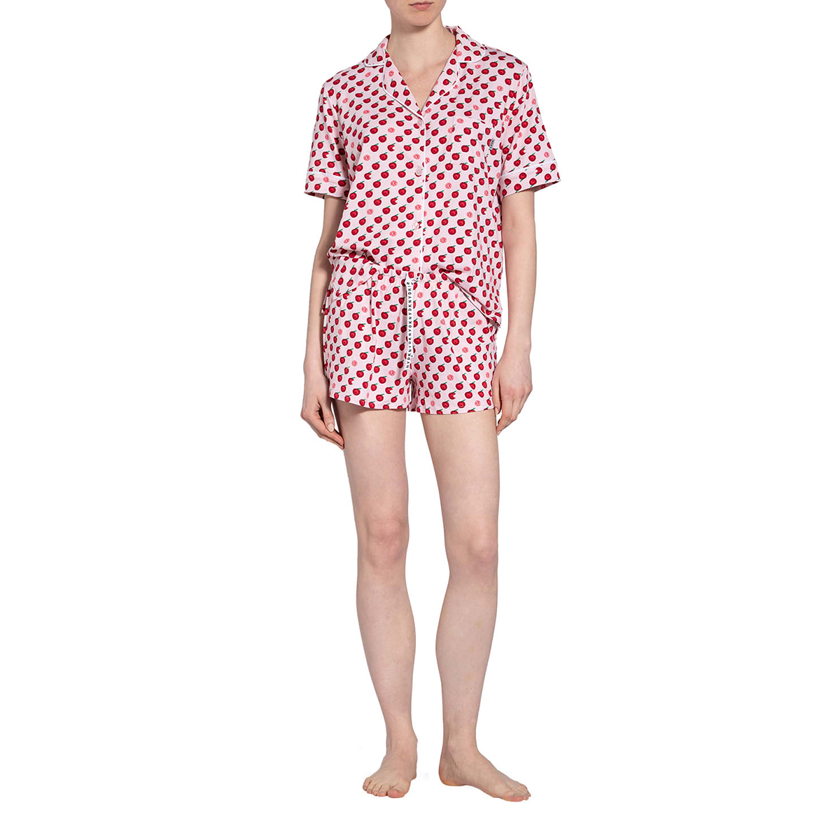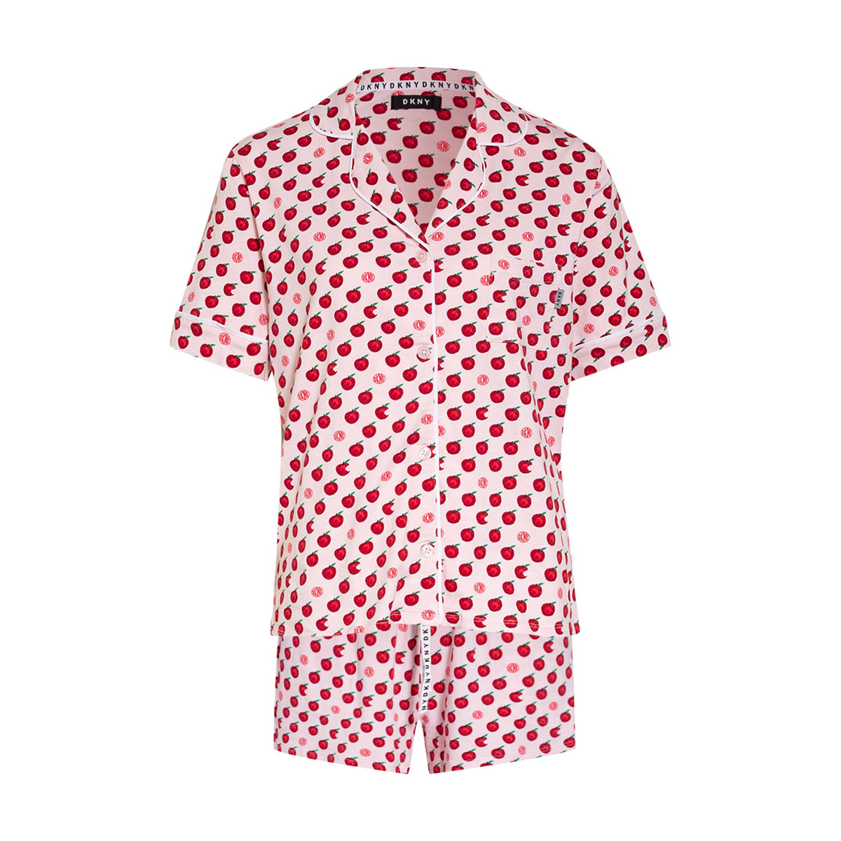 Пижама: жакет+шорты. Жакет - свободного кроя с короткими рукавами на пуговицах, с воротничком. Небольшой нагрудный карман с логотипом. Контрастная отделка на воротничке и рукавах. Короткие шорты - свободного кроя на завязках с логотипом и боковыми карманами.