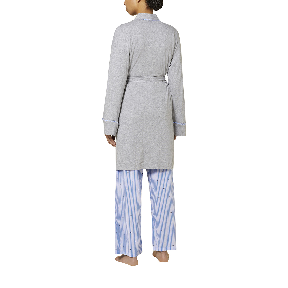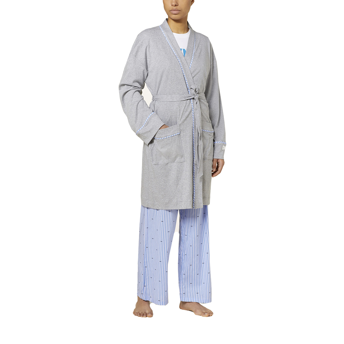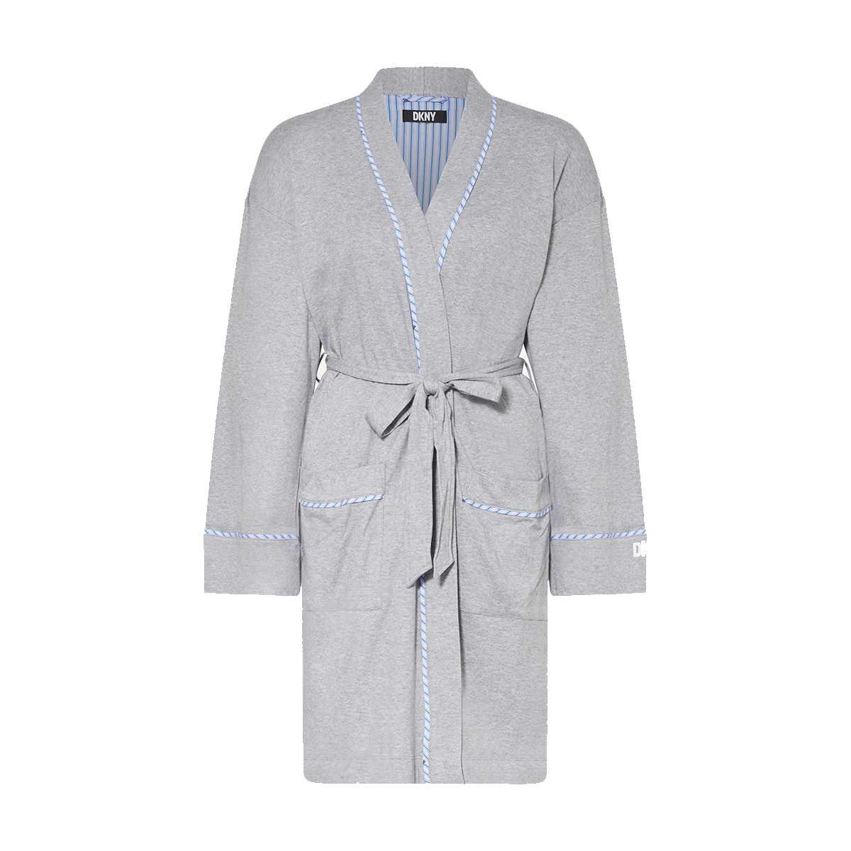 Короткий халат свободного кроя, с длинными рукавами, на поясе, с карманами, с контрастной отделкой.