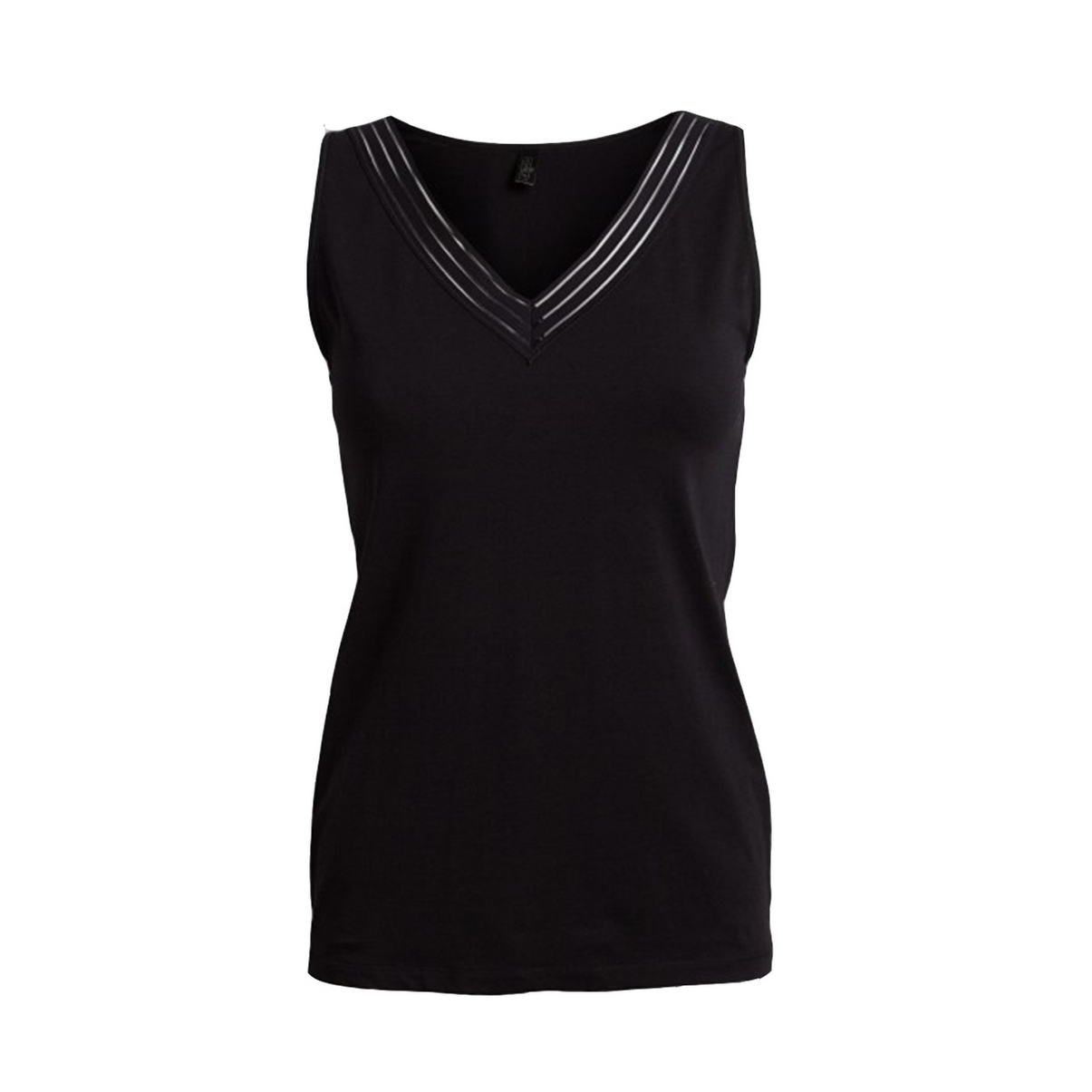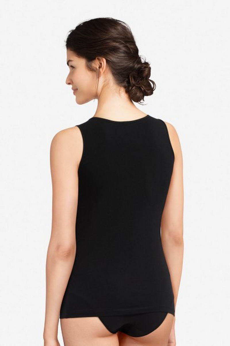 Майка на тонких регулирующихся бретелях. Верхний край передней панели декорирован. Выполнена из мягкого хлопка высокого качества.