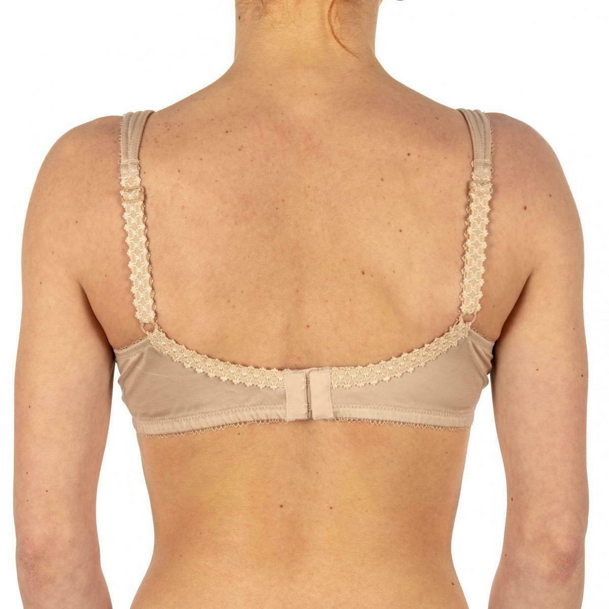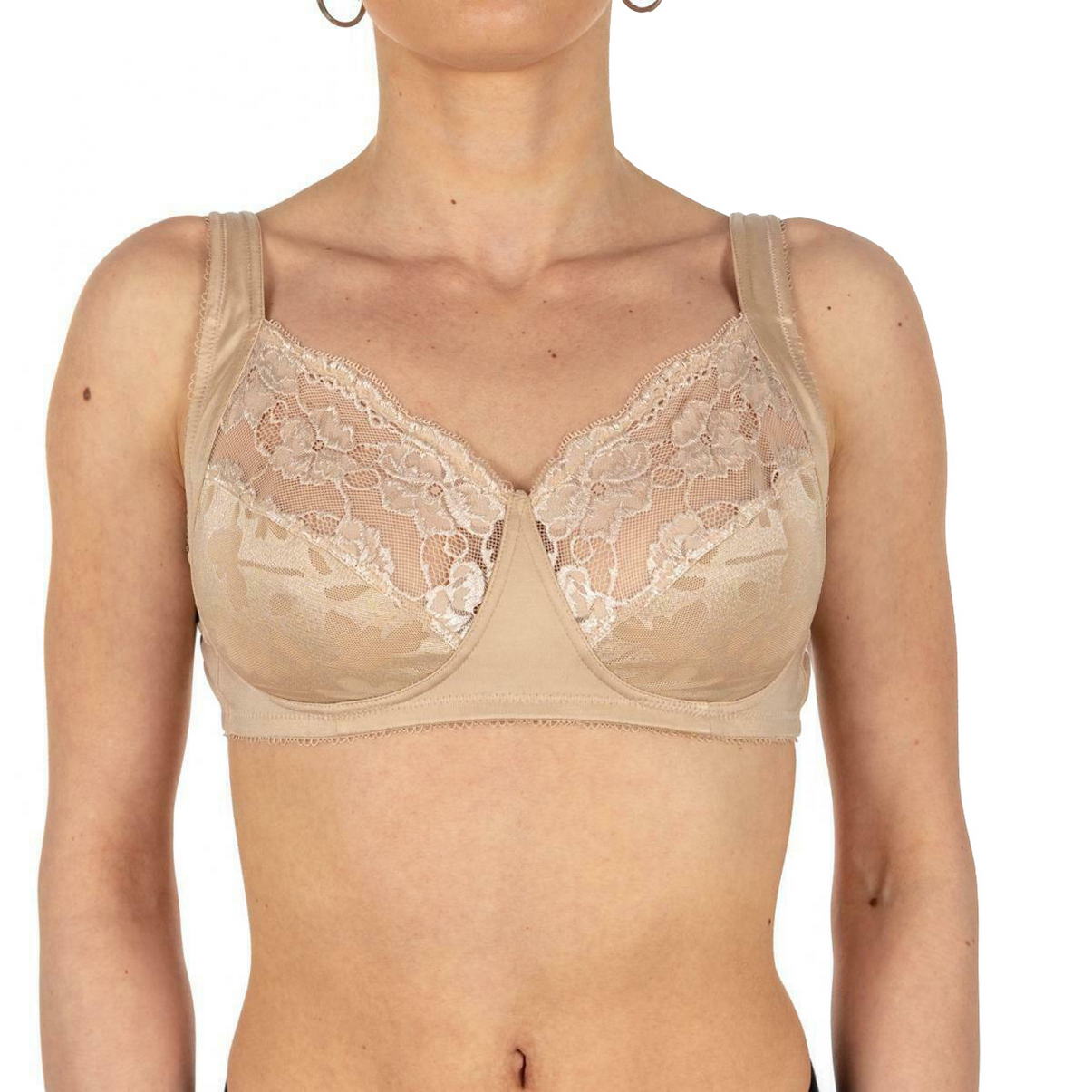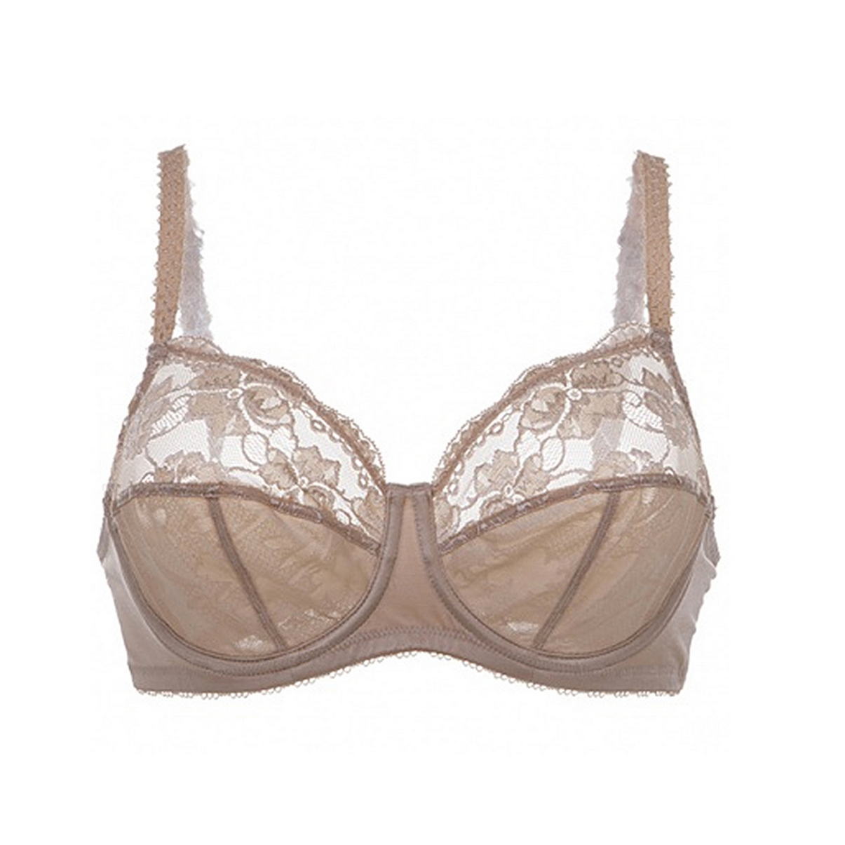 Бюстгальтер - классический на косточках с мягкой закрытой формой чашек. Чашки выполнены из кружева с цветочным орнаментом, с внутренней стороны дублированы тюлем для придания необходимой поддеркжи. Регулирующиеся декоративные бретели, для больших размеров, оснащены в области плеч "подушками" для избежания давления.