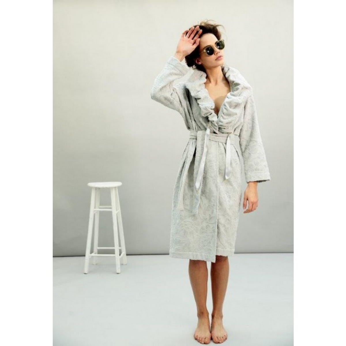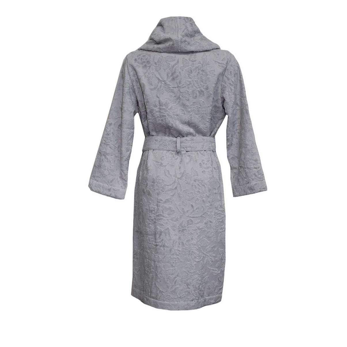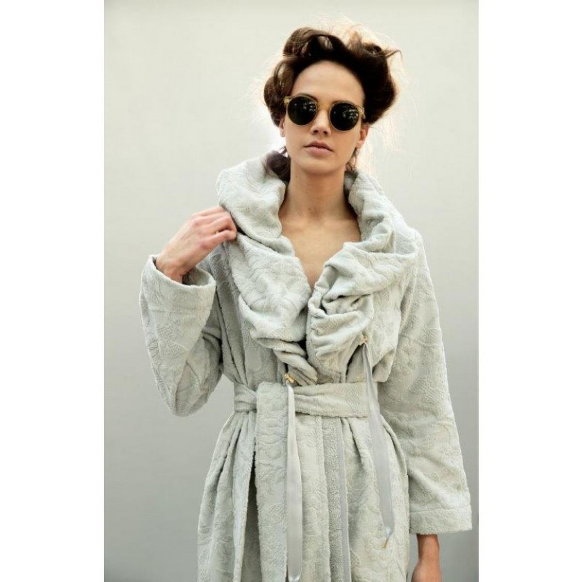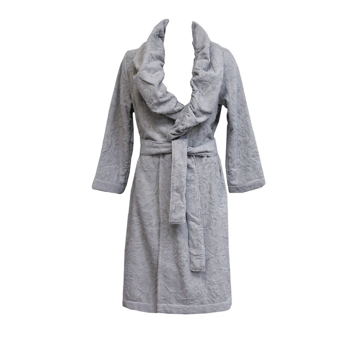 Махровый халат с длинным рукавом, выполнен из ткани с рельефным рисунком в структуре махры. Объемный воротник по краю собирается атласной лентой, съёмный пояс подчеркивает силуэт. Цельнокроеное махровое полотно, втачной рукав.