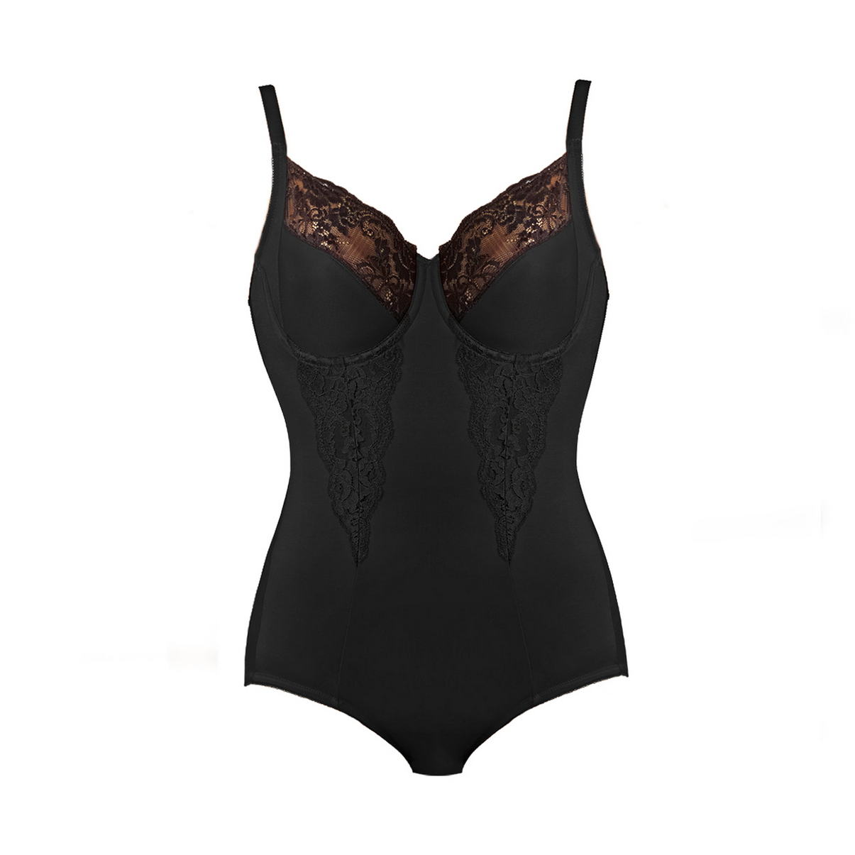 Боди с мягкой формой чашек на косточках. Чашки состоят их трех частей: нижняя часть из плотного практически не эластичного материала, верхняя - из кружева, боковая - переходящая в бретель - также из плотого не эластичного материала, чтобы сгладить неровности в области подмышек. Передняя панель полностью дублирована для визуальной коррекции, задняя - дублирована по линии талии. Регулирующиеся бретели. Застежка между ног на крючках. Хлопковая ластовица.