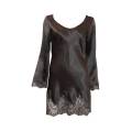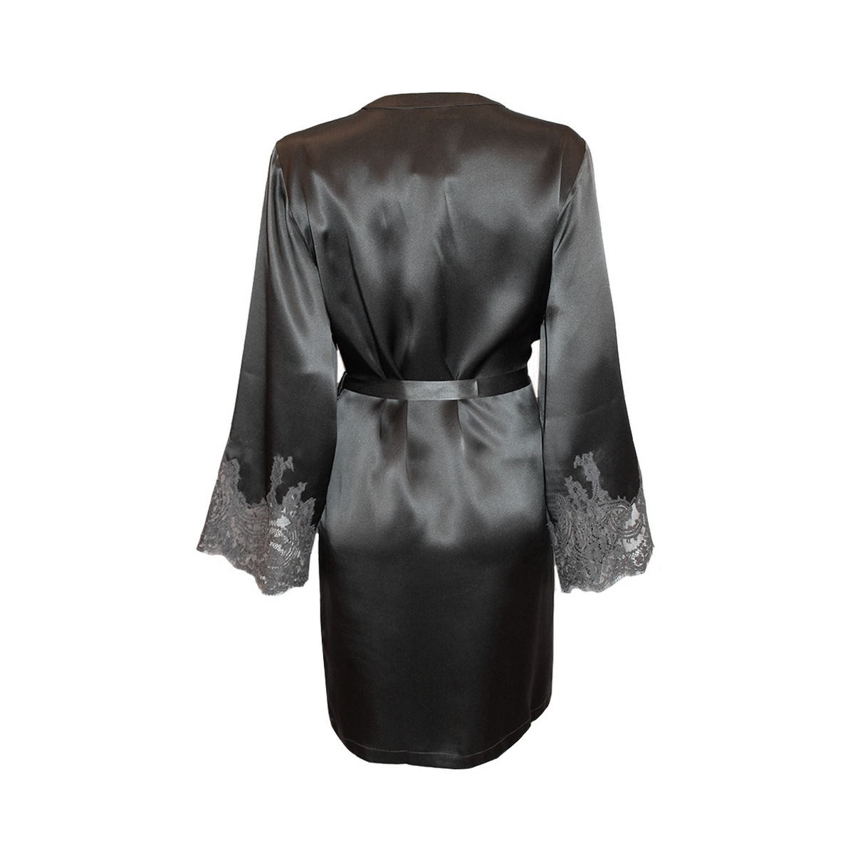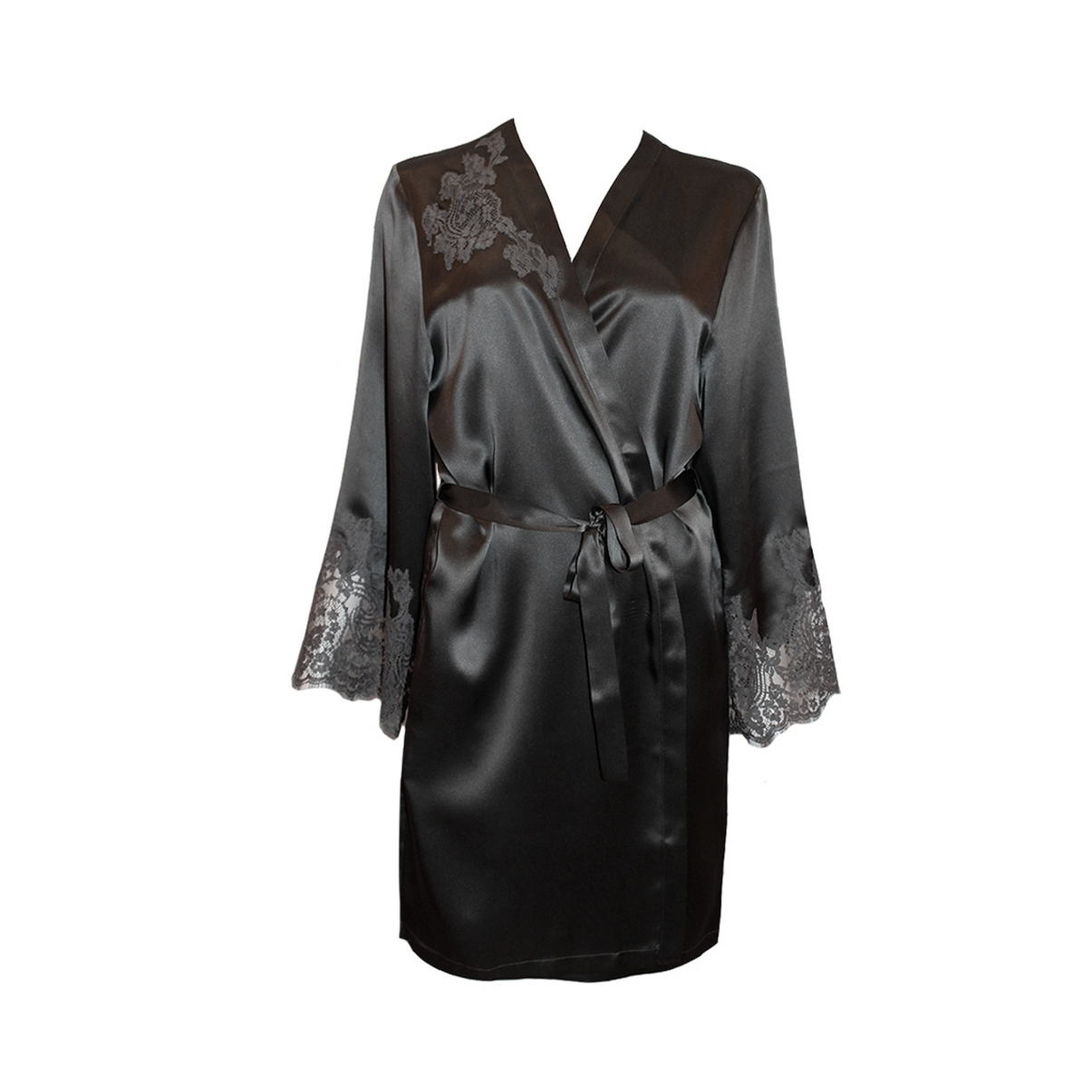 Халат короткий из атласного шелка декорирован роскошной кружевной аппликацией. Рукав инкрустирован цветочным кружевом. Модель фиксируется изнутри на завязку и снаружи на узкий пояс. Карманы-невидимки в боковых швах. Изделие выполнено из нежнейшего шелка и лучшего кружева "Кале".