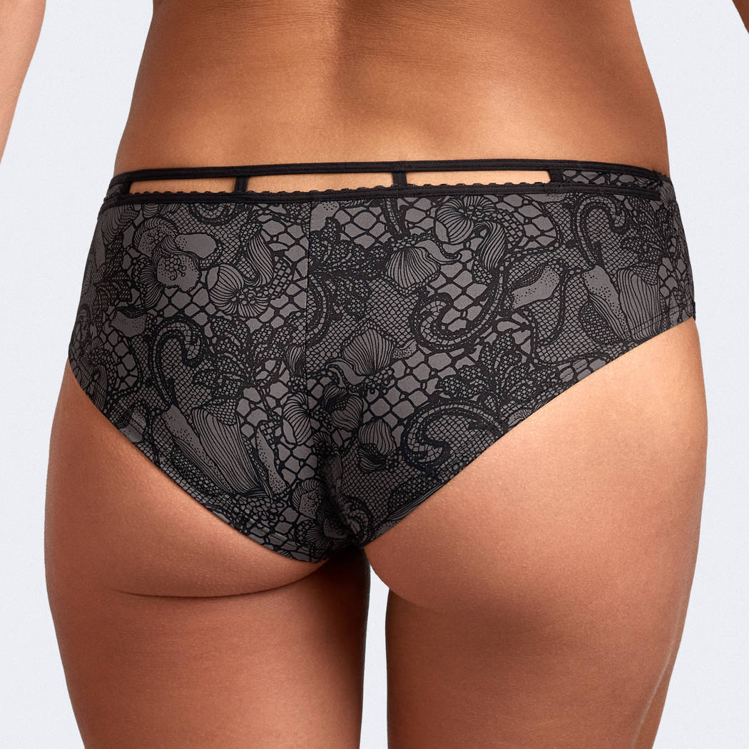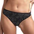 "Стань дерзкой красоткой, как французская пиратка Жанна де Клиссон, в этом дерзком, но очень чувственном сочетании кожи и кружева!" Очень привлекательные трусики подходят любому типу фигуры; боковые части шириной 5 см; эта модель практически полностью прикрывает ягодицы и частично - бедра и пах; живот прикрыт наполовину.