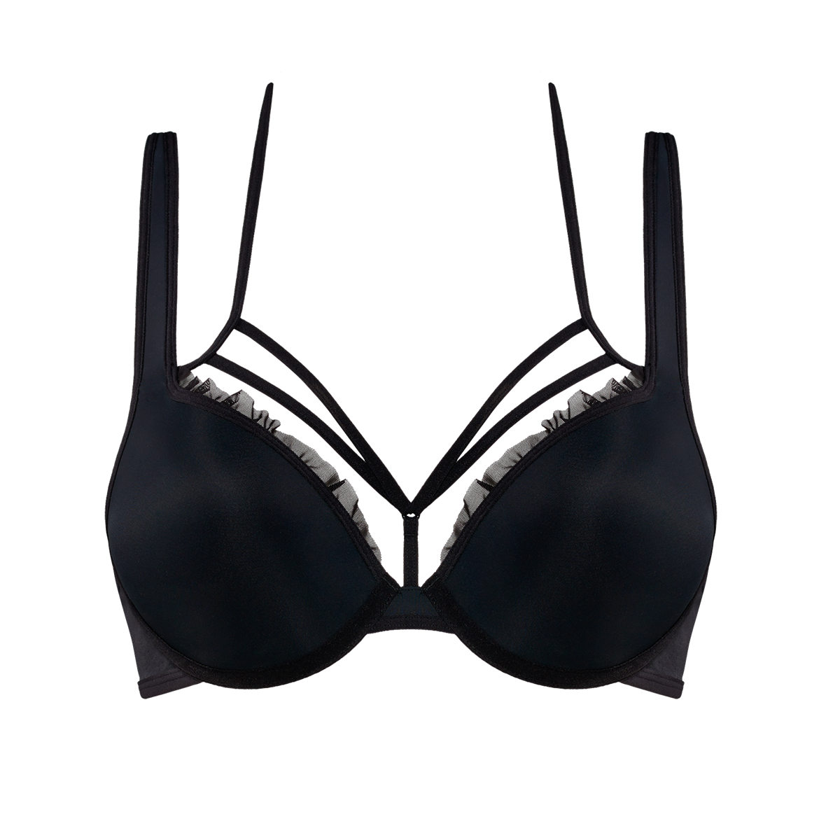 Пуш ап с плотной чашкой; очень глубокий и откровенный вырез; благодаря маленьким вкладышам в чашках и близко расположенным друг к другу косточкам он слегка приподнимает и сдвигает грудь к центру; Очень откровенная и сексуальная форма.