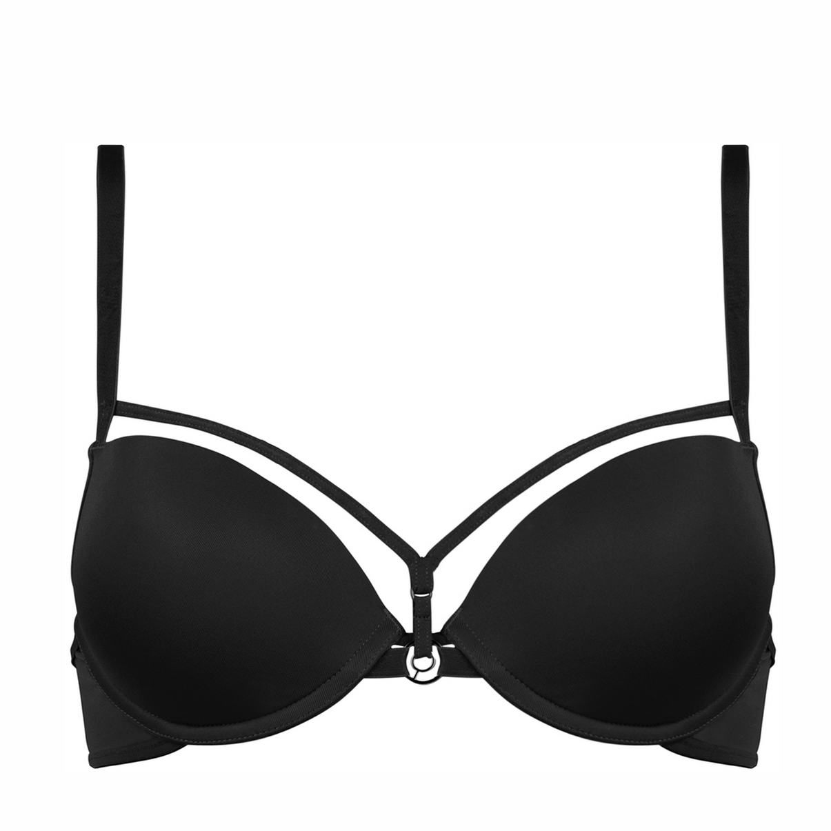 Пуш-ап с плотной чашкой; очень глубокий и откровенный вырез; благодаря маленьким вкладышам в чашках и близко расположенным друг к другу косточкам он слегка приподнимает и сдвигает грудь к центру; очень откровенная и сексуальная форма.