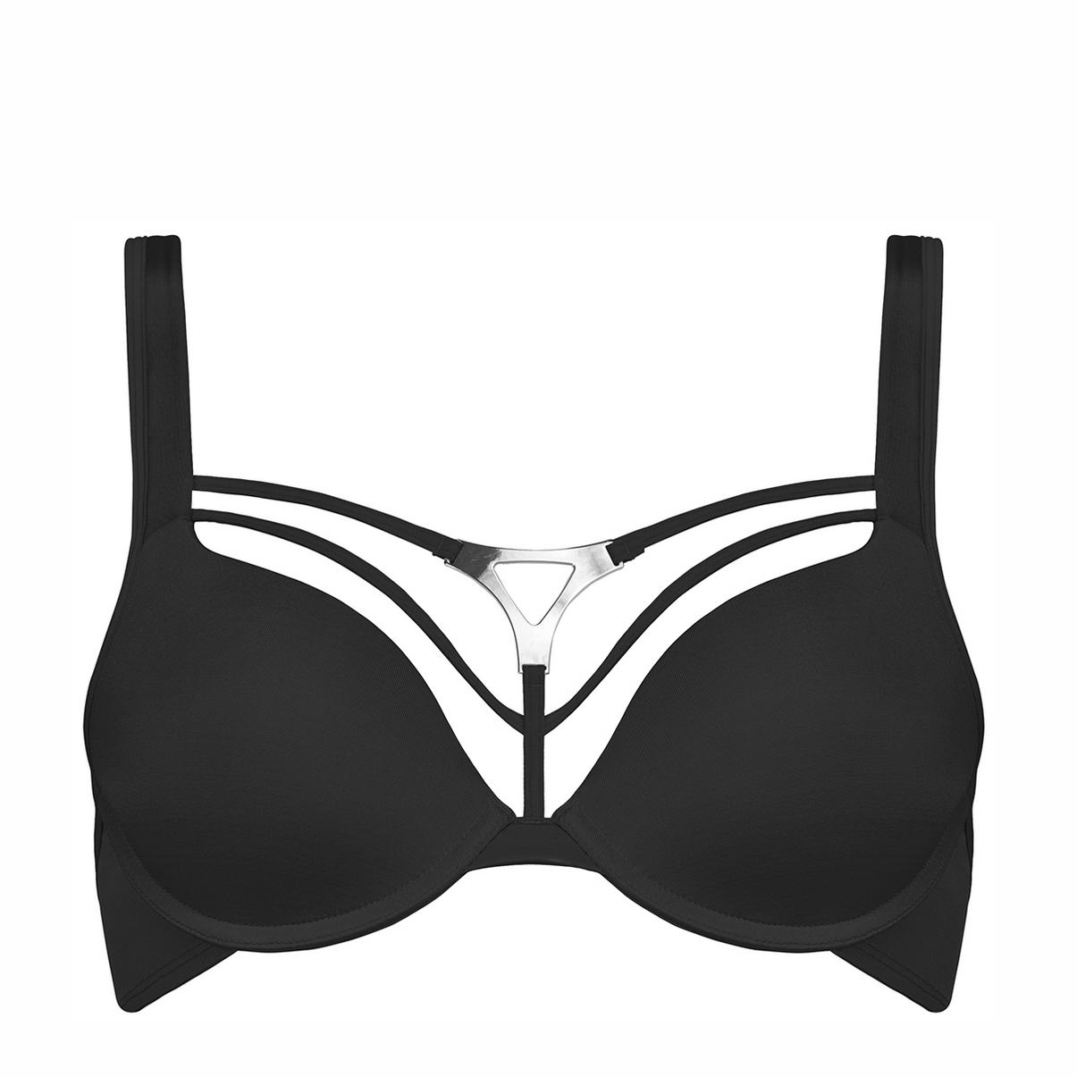 Бюстгальтер с плотной чашкой и глубоким вырезом, интригующе украшенный треугольной деталью; благодаря близко расположенным друг к другу косточкам бюстгальтер слегка приподнимает и сдвигает грудь к центру; очень откровенная и сексуальная форма.
