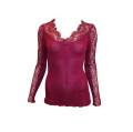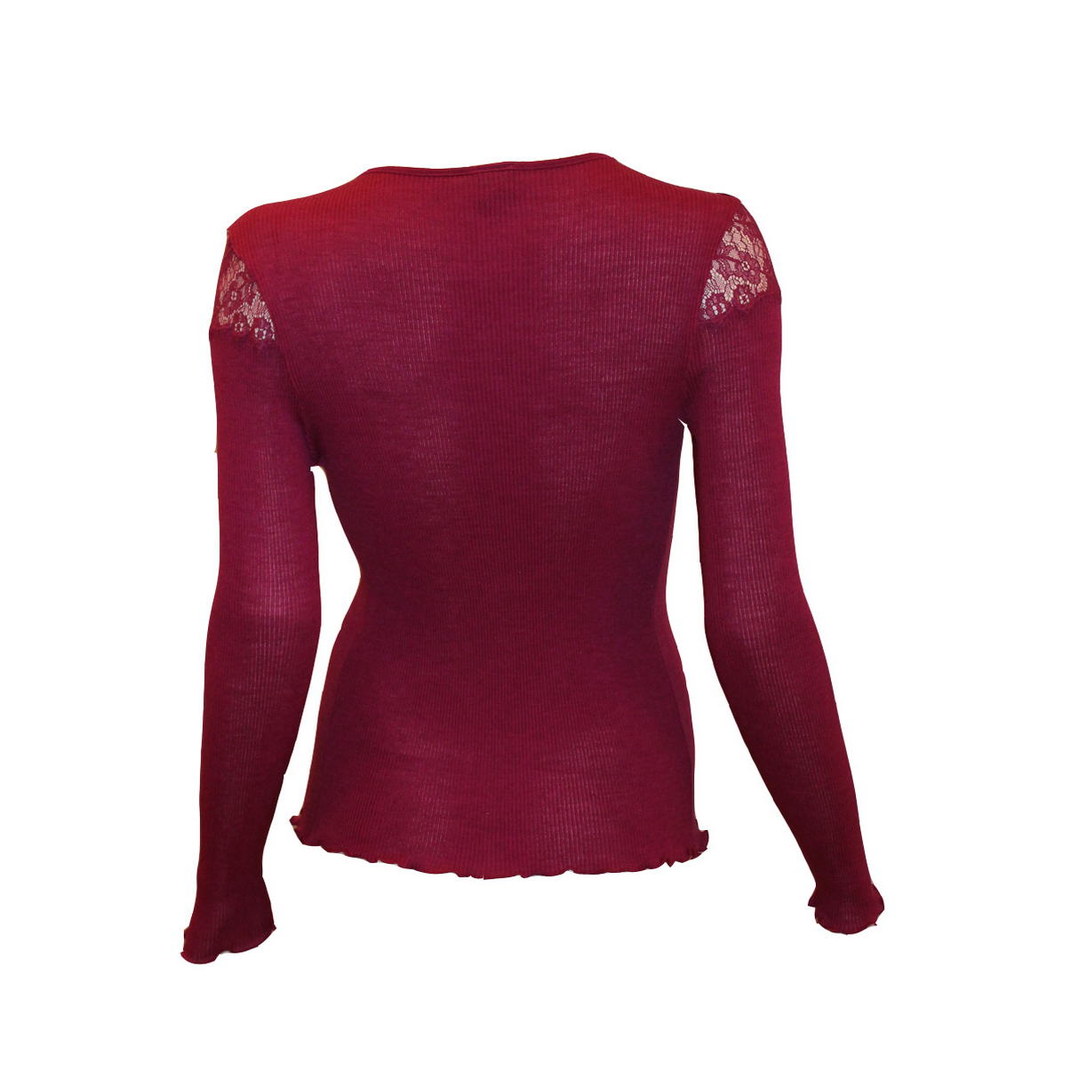 Кофта с длинным рукавом. Застежка на маленьких пуговичках в тон. Кокетку спереди и низ застежки декорирует кружево с ресничками.