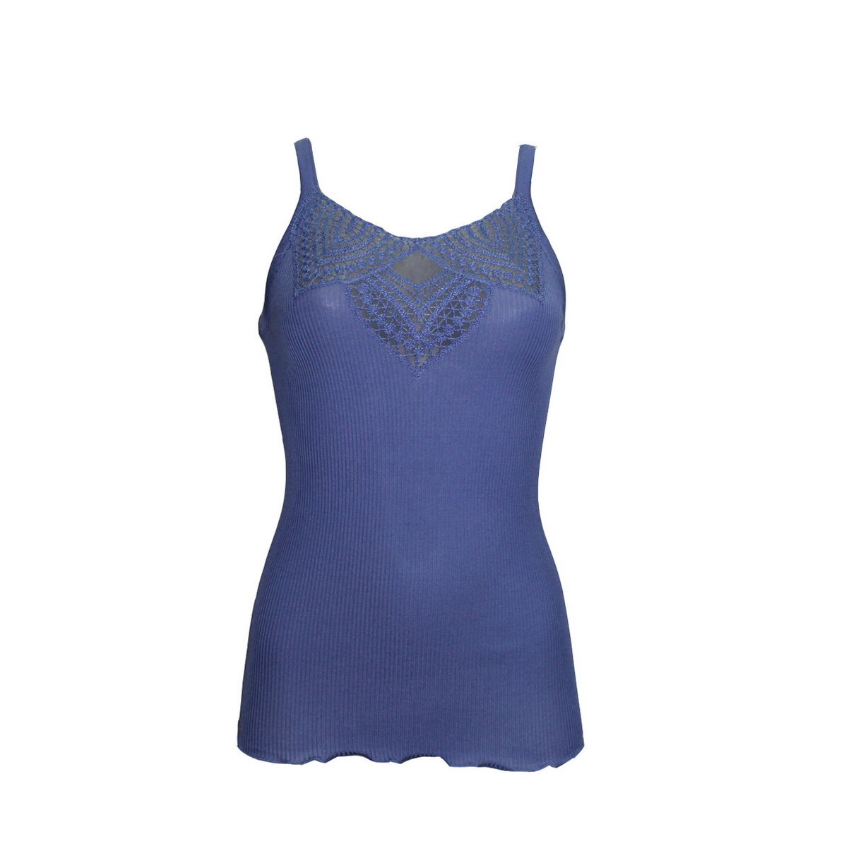 Майка – топ выполнена из бесшовного трикотажного полотна. Верхняя часть передней панели выполнена из ажурного орнамента. Низ изделия - оверлок.