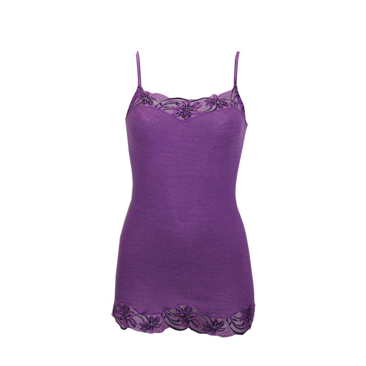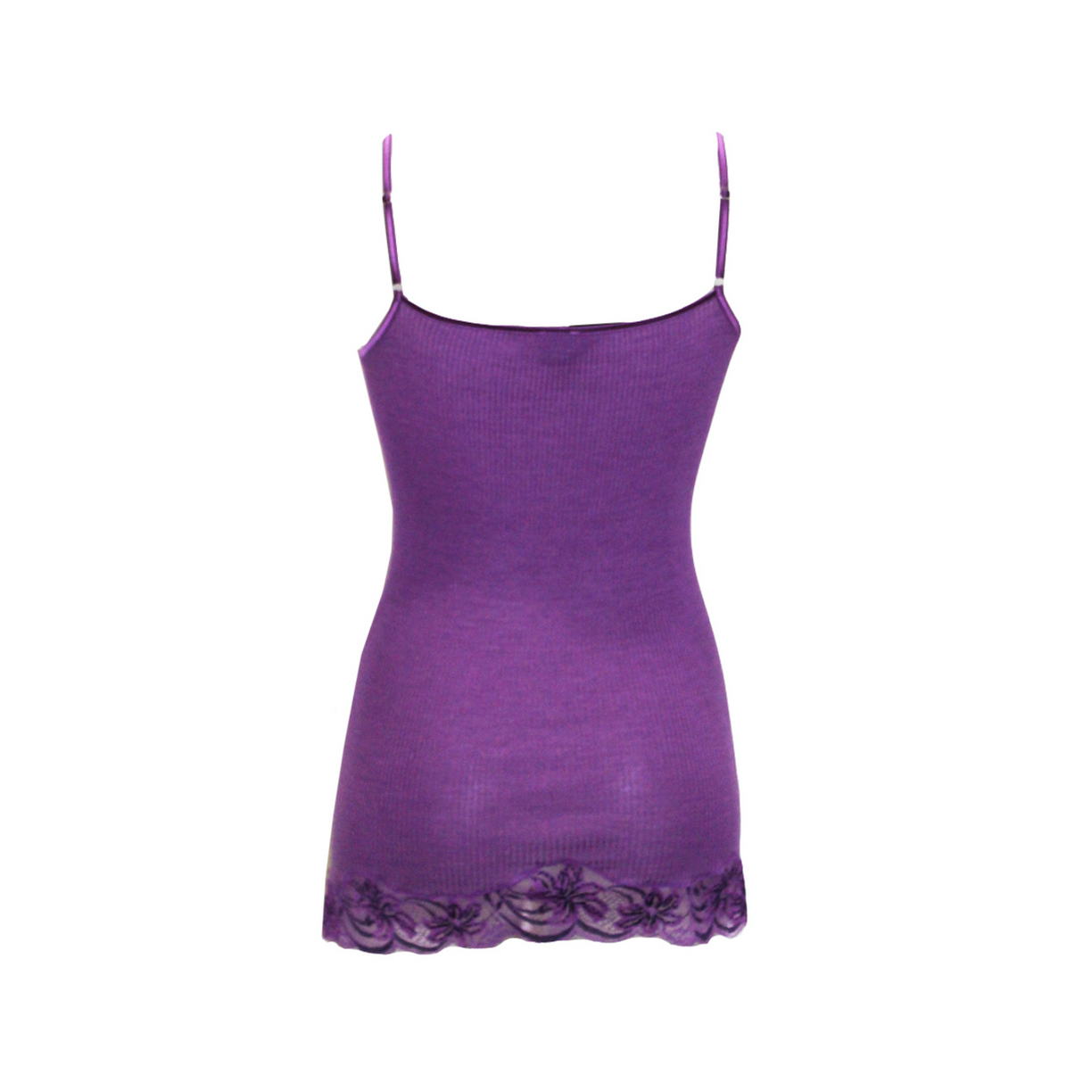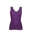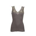 Майка на тонких бретелях, которые регулируются по длине. Изделие выполнено из бесшовного трикотажного полотна. Фигурное декольте и низ модели украшены двухцветным кружевом в тон.
