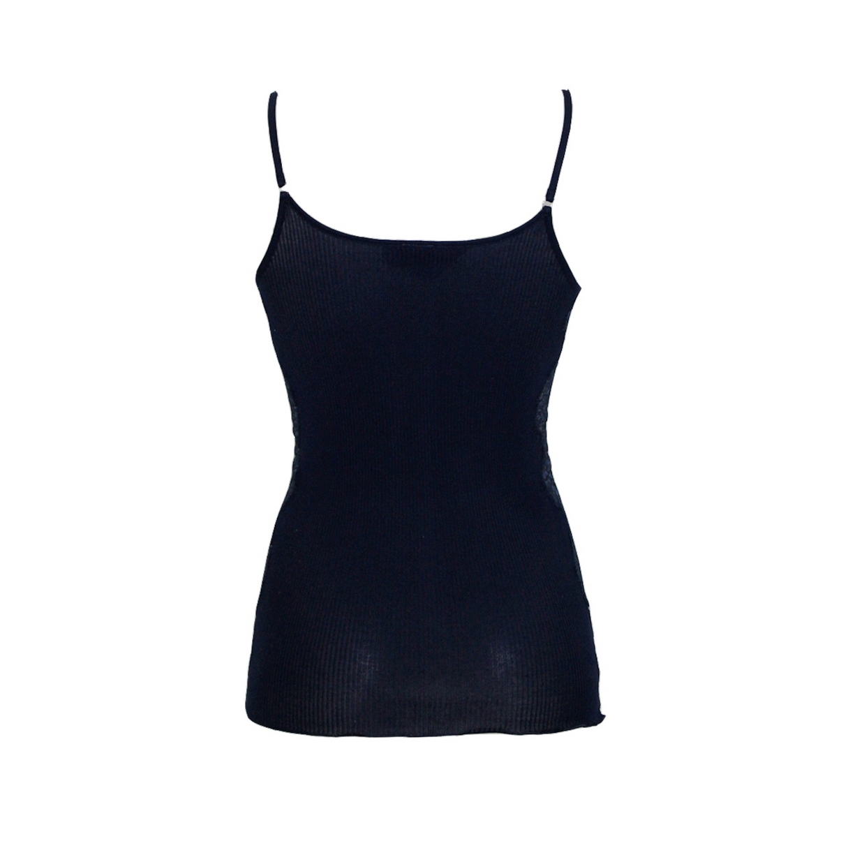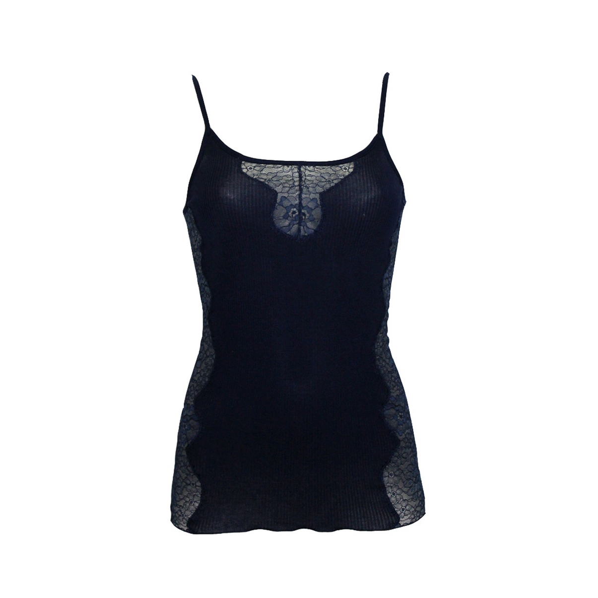 Майка на тонких бретелях из трикотажного полотна. Боковые вставки и декольте выполнены из кружева. Низ изделия - мягкий волан (оверлок).