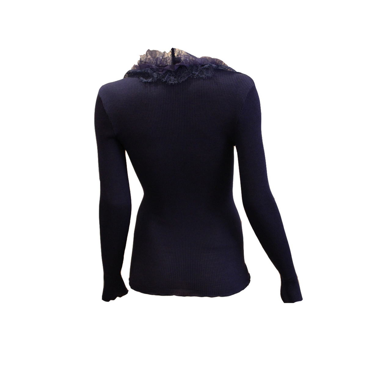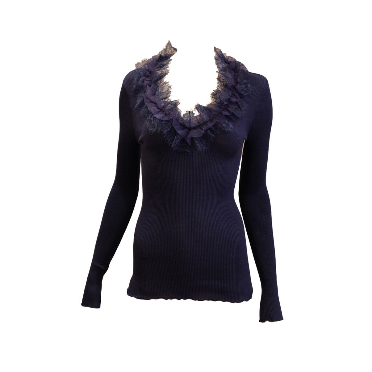 Кофта с длинным рукавом из бесшовного трикотажного полотна. Глубокое декольте декорировано двойным кружевом и шифоном. Низ изделия - мягкий волан (оверлок).