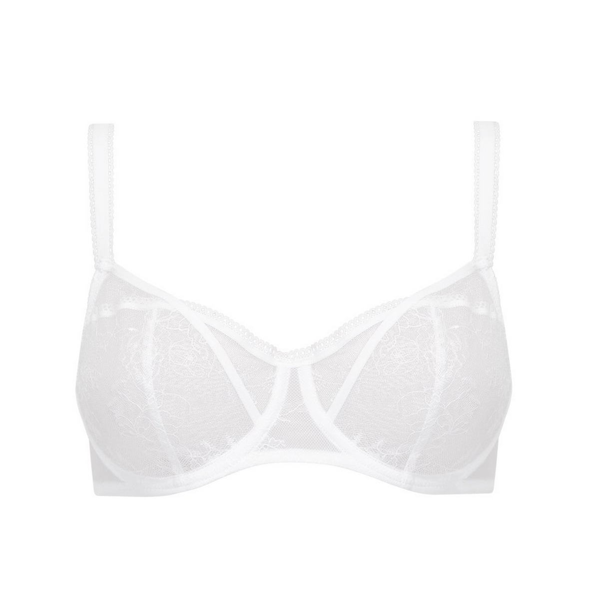 Бюстгальтер-балконет с мягкой формой чашек на косточках. Чашки выполнены из кружева с цветочным орнаментом. Область декольте дополнена декоративной тесьмой. Регулирующиеся бретели.