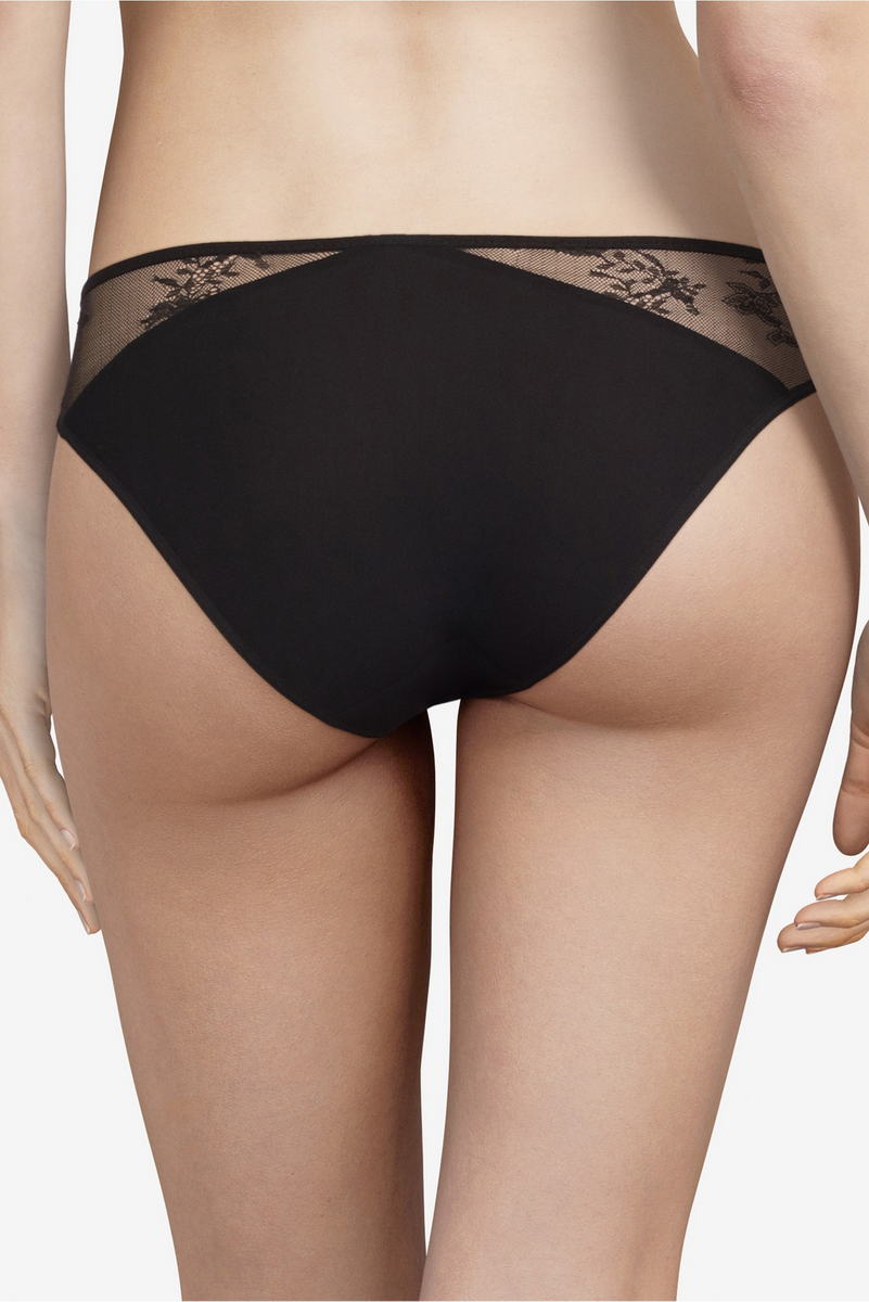 Трусы - классические со средне-заниженной посадкой. Полностью выполнены из непрозрачной микрофибры. Боковые панели декорированы вставками из кружева с цветочным орнаментом.
