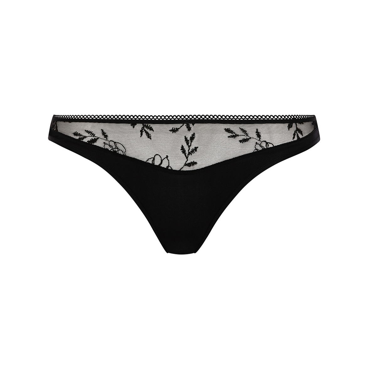 Трусы - стринги со средне-заниженной посадкой. Передняя и задняя панели выполнены из непрозрачной микрофибры; по-верхнему краю декорированы кружевом с цветочным орнаментом.