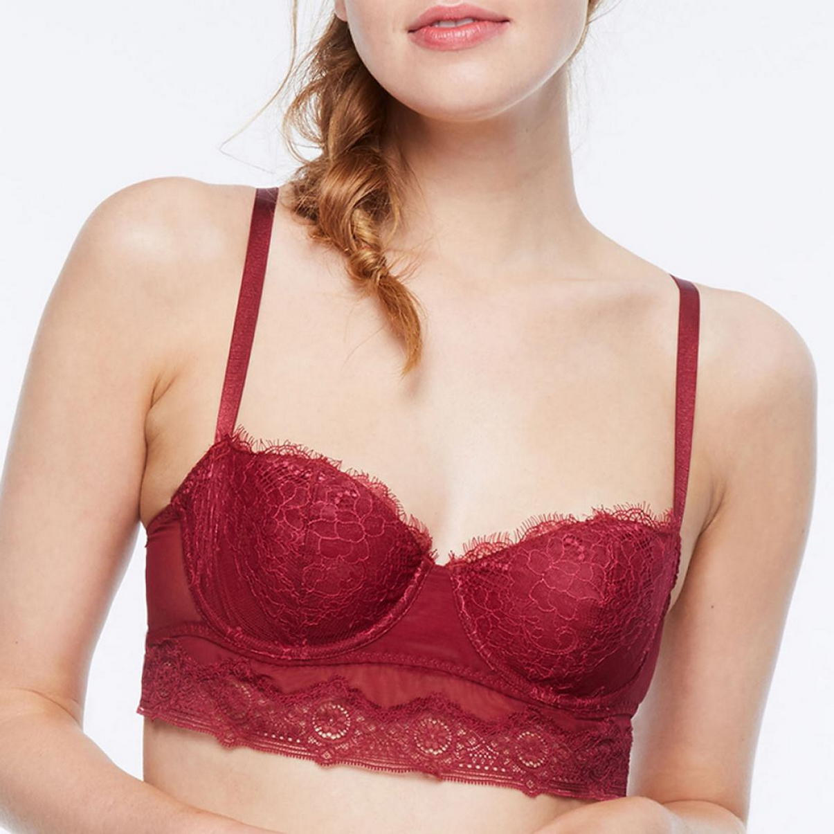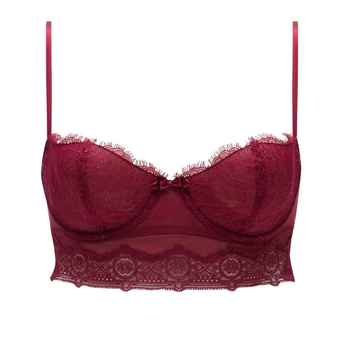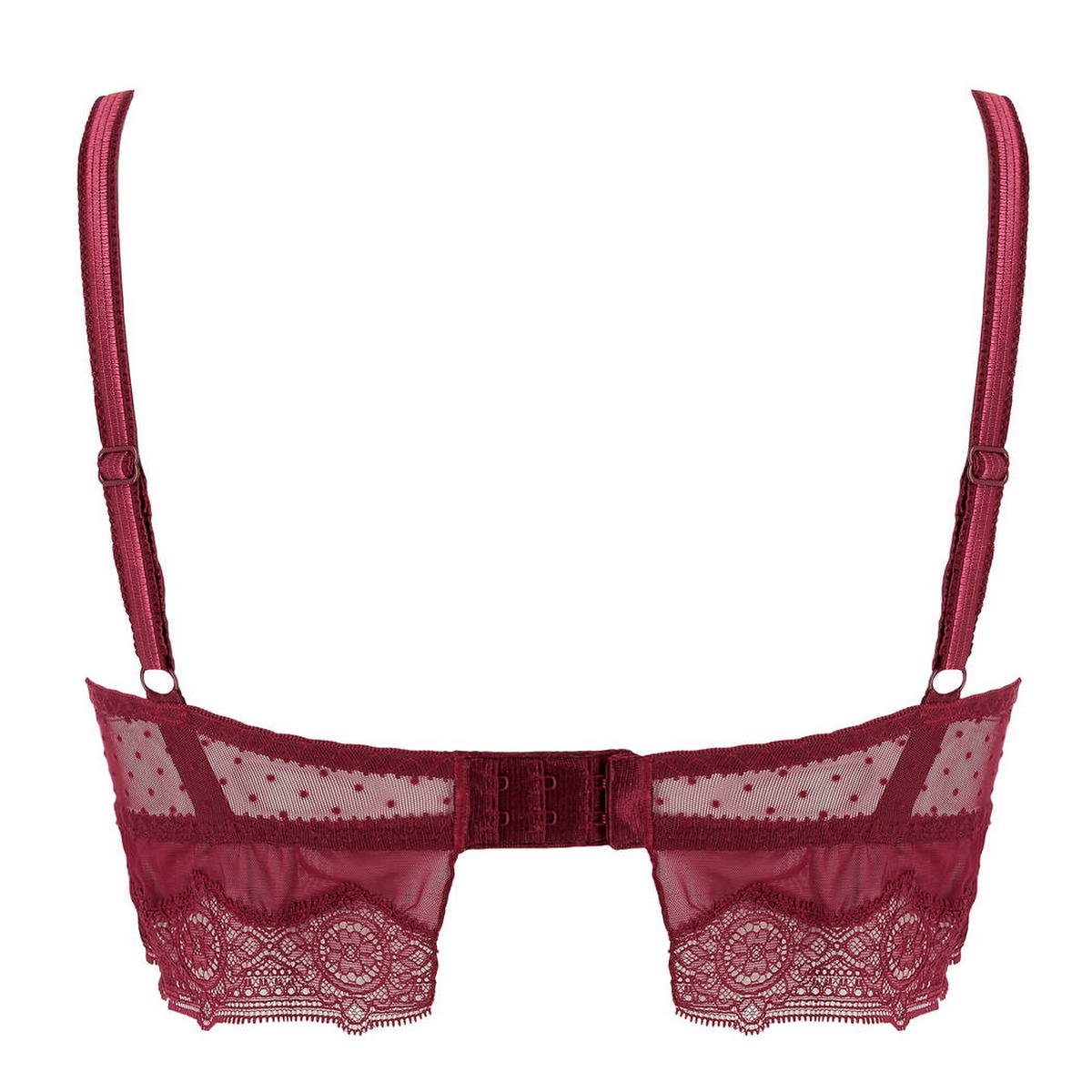 Бюстгальтер-балконет корсетного типа. Бюстгальтер с мягкой полуоткрытой формой чашек на косточках. Чашки дублированы тюлем для придания необходимой поддержки. Основа бюстгальтера - тюль в горошек, чашечки из нежнейшего цветочного кружева. Область декольте украшена декоративными ресничками. Нижний край бюстгальтера из красивого графичного кружева. Декоративные регулирующиеся бретели.