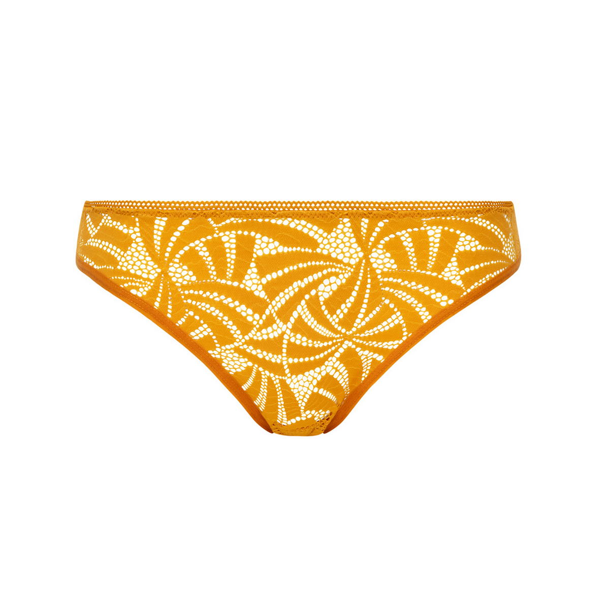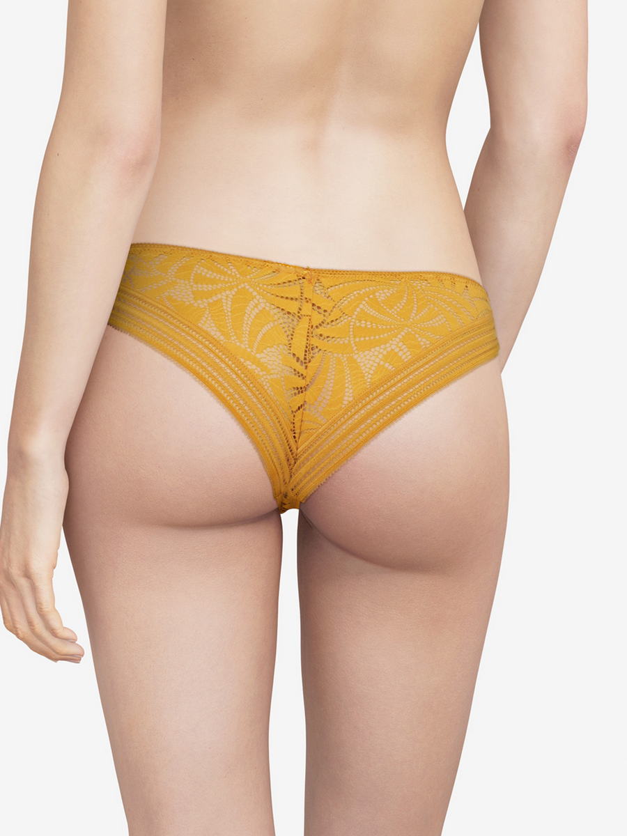 Трусы-танга (задняя панель более широкая, чем в стрингах) со средне-заниженной посадкой. Полностью выполнены из кружева с графичным орнаментом. Нижние края задней панели дополнены декоративной тесьмой.
