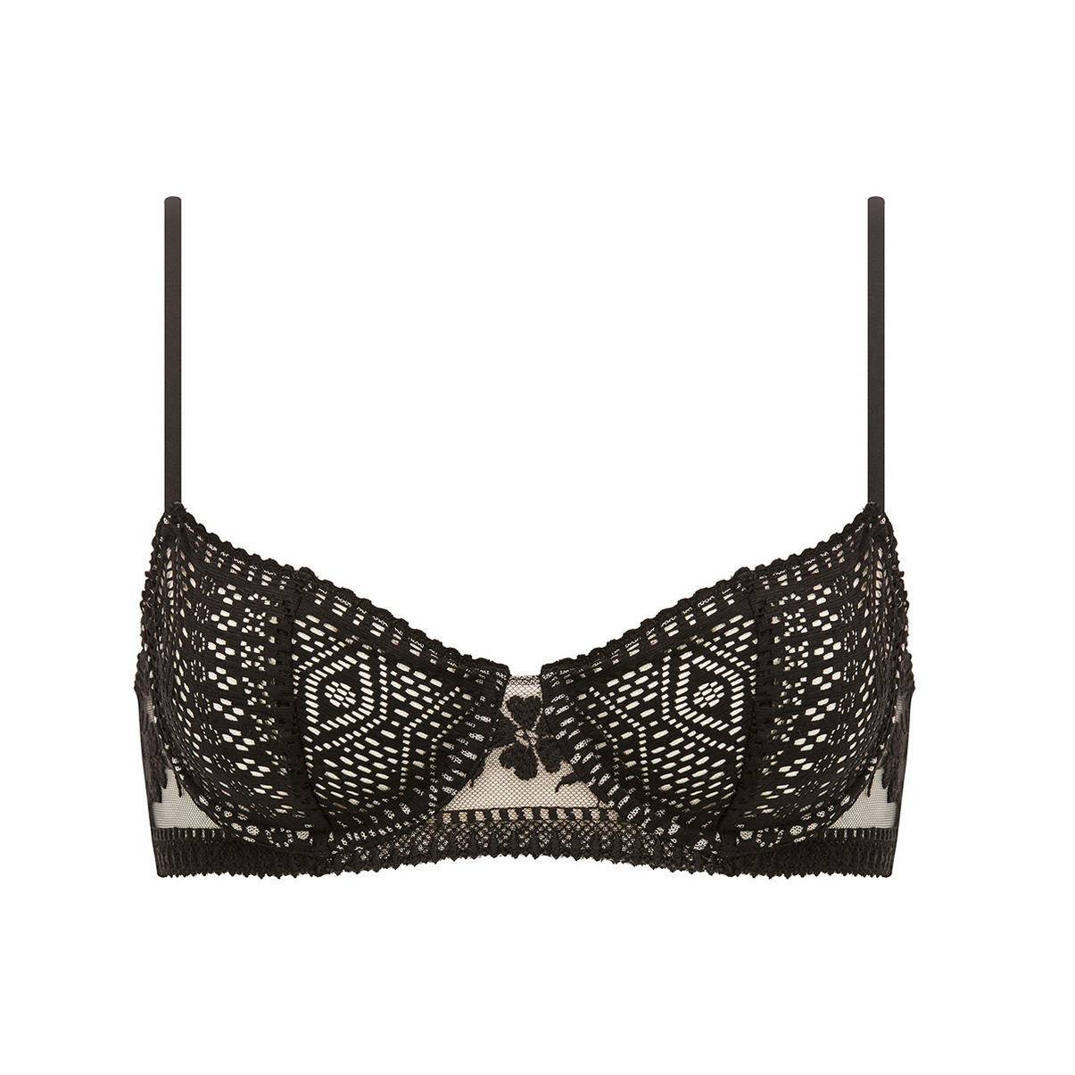 Бюстгальтер - балконет с мягкой откытой формой чашек на косточках. Чашки выполнены из ажурного кружева; основа бюстгальтера - расшитая цветочным орнаментом сетка; задние панели - из ажурного кружева. Регулирующиеся бретели.
