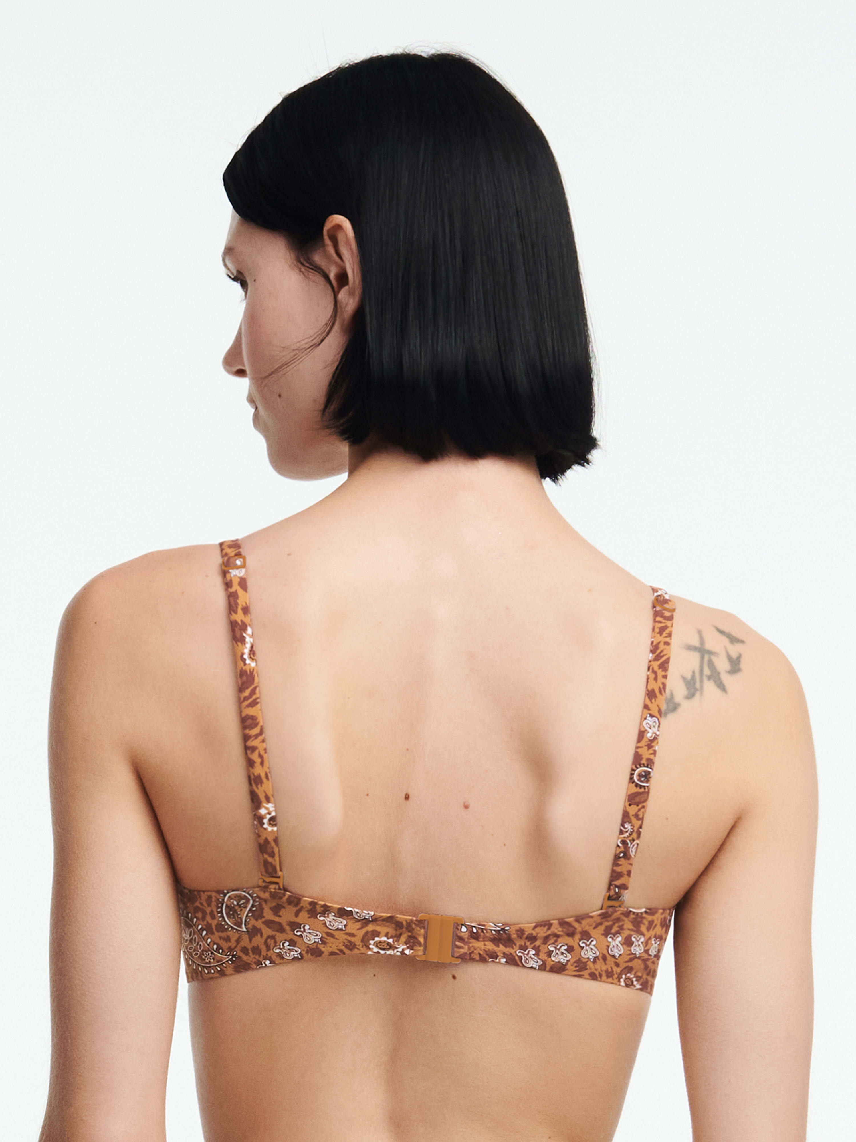 Бюстгальтер - классический с мягкой достаточно закрытой формой чашек на косточках. Высоту чашек можна регулировать благодаря тому, что край чашки, который рассположен в подмышечной зоне не зафиксирован. Регулирующиеся бретели. Застежка сзади - на клипсе.