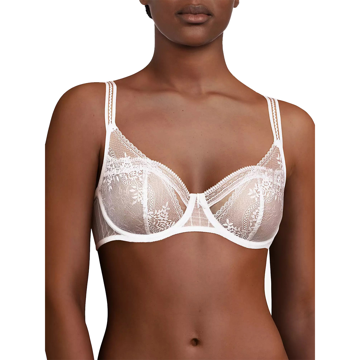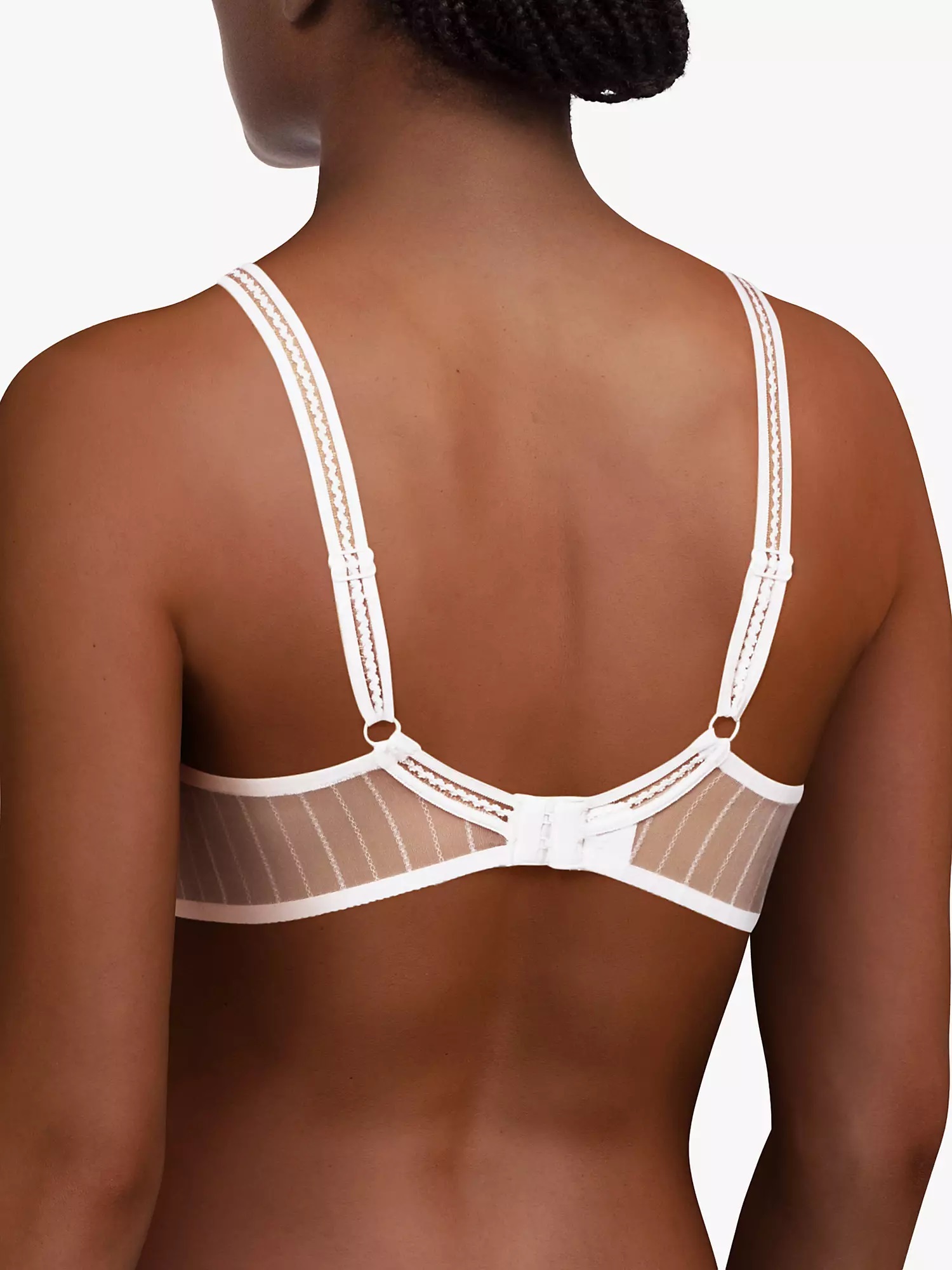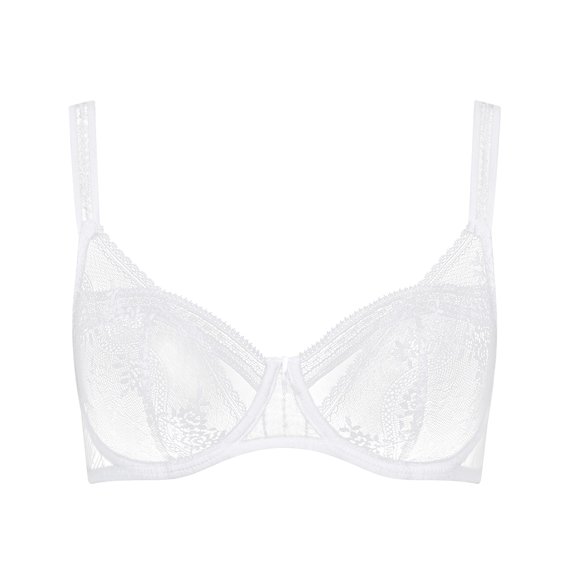 Бюстгальтер - балконет с мягкой формой чашек на косточках. Чашки выполнены из прозрачного тюля и покрыты изысканным кружевом с цветочными мотивами. Область декольте дополнена кружевной тесьмой. Центральная и боковые панели выполнены из тюля в полоску. Регулирующиеся бретели.