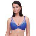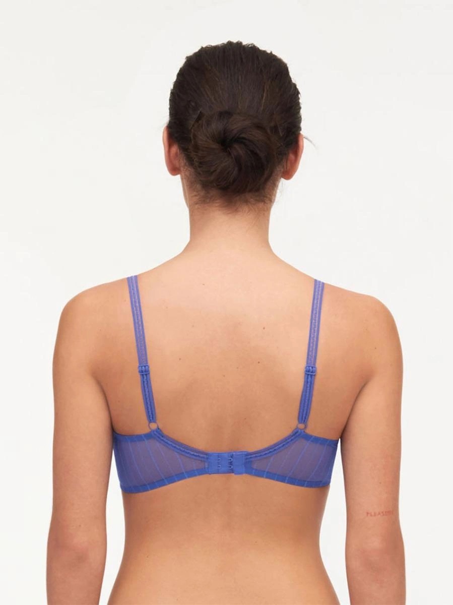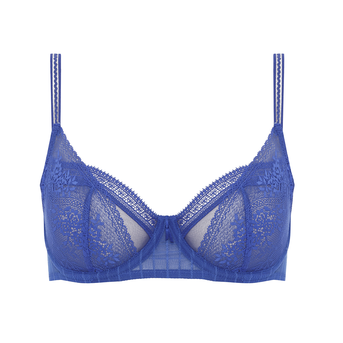 Бюстгальтер - балконет с мягкой формой чашек на косточках. Чашки выполнены из прозрачного тюля и покрыты изысканным кружевом с цветочными мотивами. Область декольте дополнена кружевной тесьмой. Центральная и боковые панели выполнены из тюля в полоску. Регулирующиеся бретели.