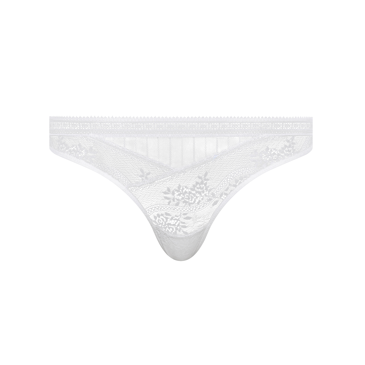 Трусы - стринги со средне-заниженной посадкой. Полностью выполнены из кружева с цветочным орнаментом. Передняя панель дополнена вставкой из тюля в полоску.