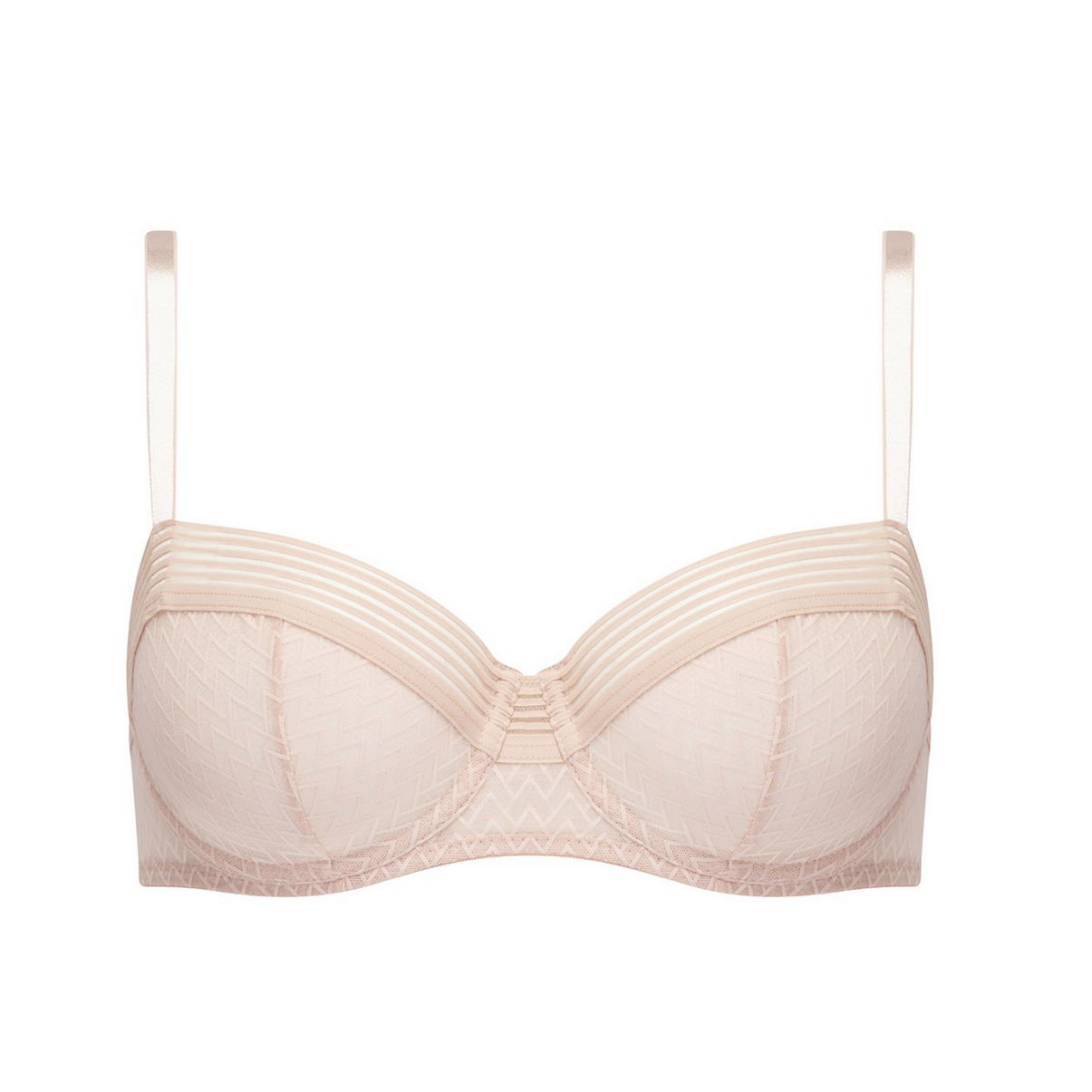 Бюстгальтер-балконет с мякгой формой чашек на косточках. Чашки выполнены из тюля с графичным орнаментом, с внутренней стороны - дублированы для придания необходимой поддеркжи. Верхний край чашек декорирован тесьмой в стиле спорт. Боковые панели также выполнены из тюля с графичным орнаментом и декорированы тесьмой в стиле спорт. Регулирующиеся бретели.