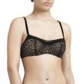 Бюстгальтер - формованный со слегка уплотненной формой чашек на косточках. Чашки выполнены из бежевого мусса и покрыты контрастным черным кружевом с узором леопарда. Верхний край для контрастного эффекта дополнен непрозрачной тесьмой из микрофибры. Регулирующиеся бретели.