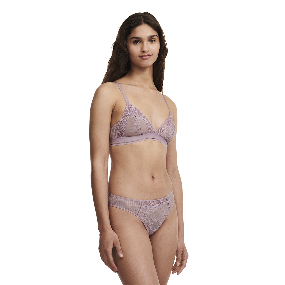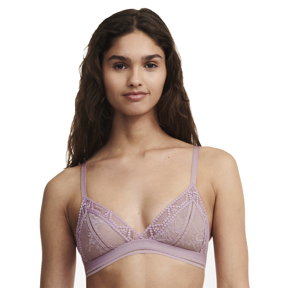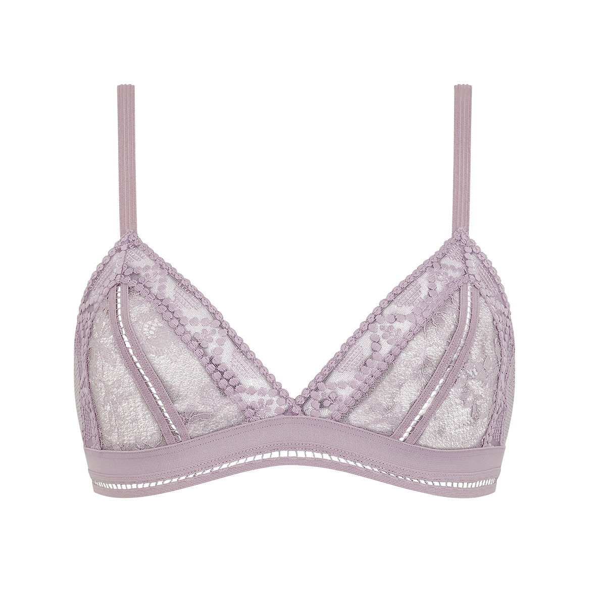 Бюстгальтер - бралетт с мягкой треугольной формой чашек; без косточек. Чашки выполнены из кружева с цветочным орнаментом и дополнены графичной отделкой и вышивкой. Основа бюстгальтера - широкая эластичная тесьма. Задняя панель выполнена из сетки. Регулирующиеся бретели.
