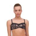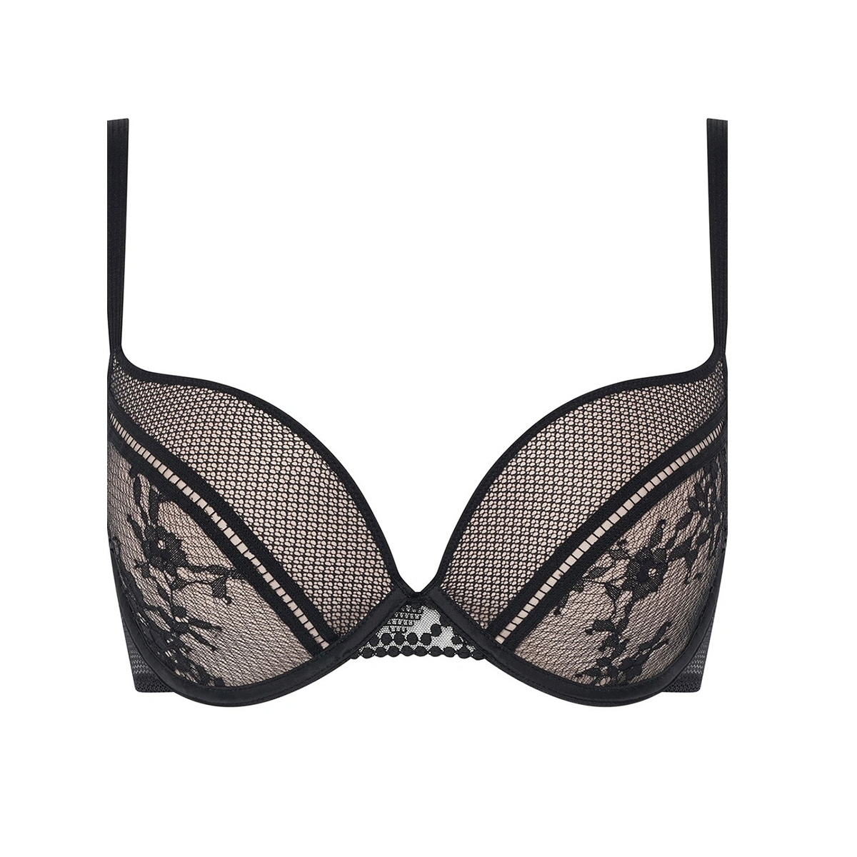 Бюстгальтер - пуш ап на косточках с интегрированными подушками. Чашки покрыты кружевом с цветочным орнаментом и сеткой; графичная отделка. Глубокая V - образная форма декольте. Задняя панель выполнена из сетки. Регулирующиеся бретели.