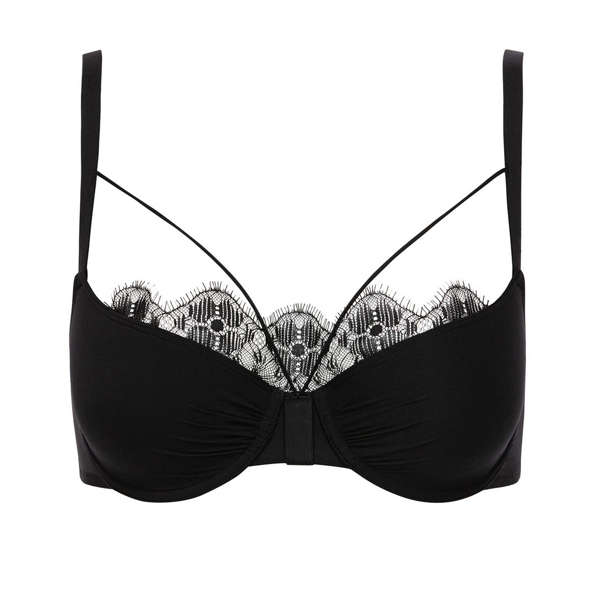 Бюстгальтер - пуш ап с вынимающимися подушками. Чашки покрыты мягким, гладким тактелем; область декольте декорирована кружевом и несъемной тесьмой. Регулирующиеся бретели.