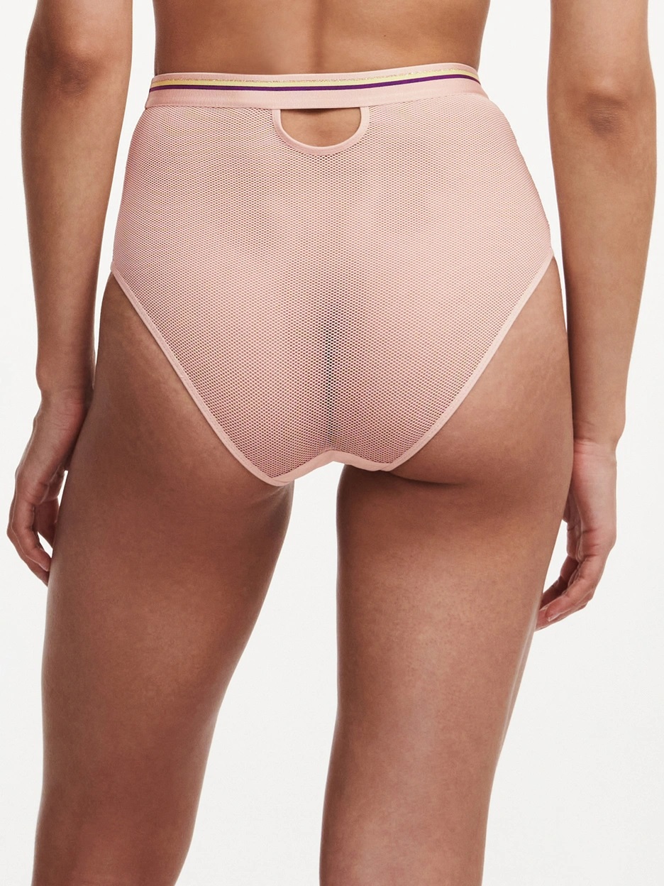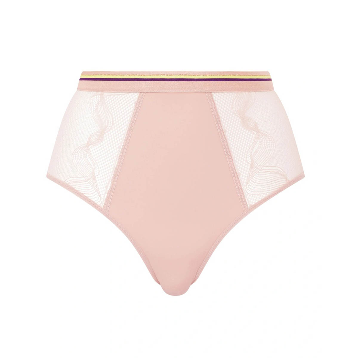 Трусы - с высокой талией с завышенной посадкой. Передняя панель выполнена из непрозрачной микрофибры, боковые панели - из прозрачного кружева, задняя - из сетки. По-верхнему - широкий эластичый пояс в стиле спорт - шик.