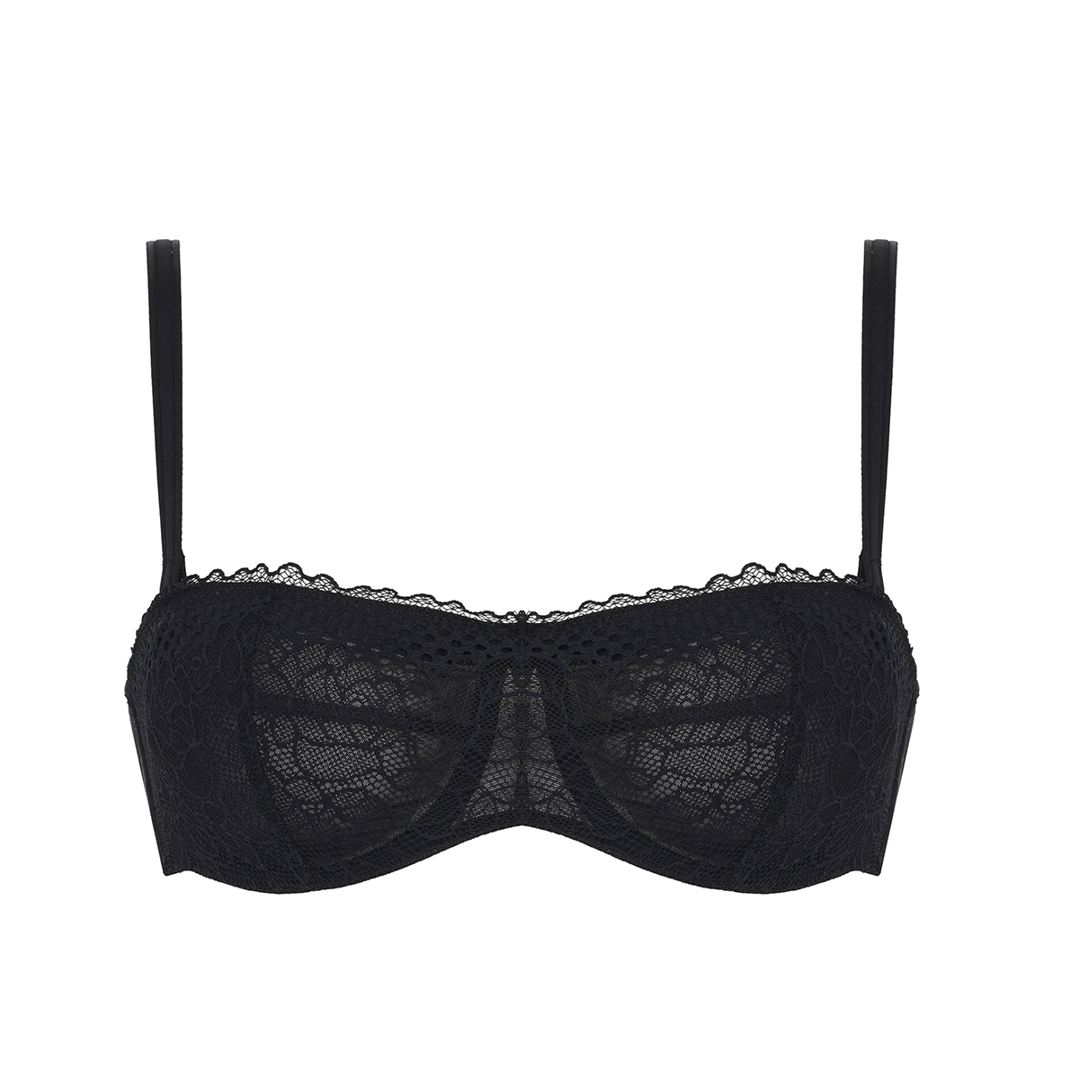 Бюстгальтер - балконет с мягкой открытой формой чашек на косточках. Чашки выполнены из изысканного кружева, с внутренней стороны дублированы и оснащены по-верхнему краю чашек и боковых панелей силиконовой дорожкой - для придания необходимой поддержки без бретелей. Отстегивающиеся бретели. Боковые панели - из непрозрачной микрофибры.