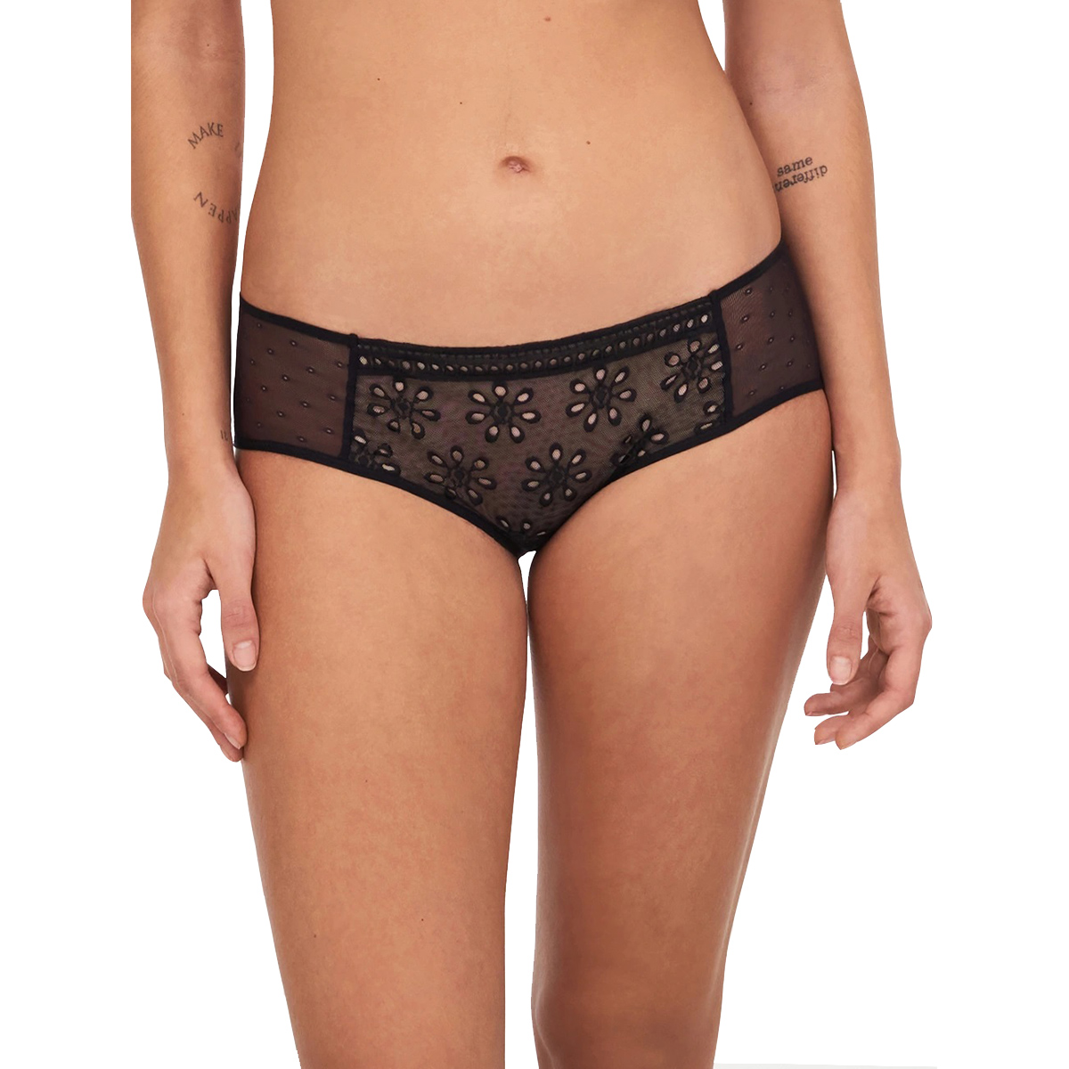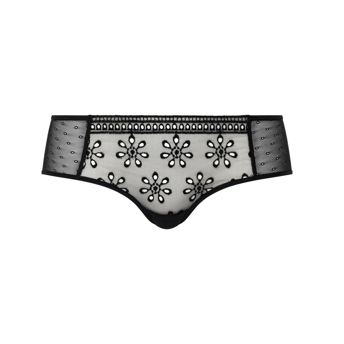 Трусы - боксеры со средне-заниженной посадкой. Передняя панель выполнена из роскошной и романтичной, неподвластной времени вышивкой в стиле Ришелье, задняя - из ажурного тюля.