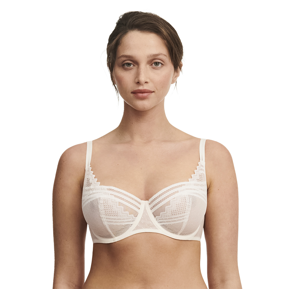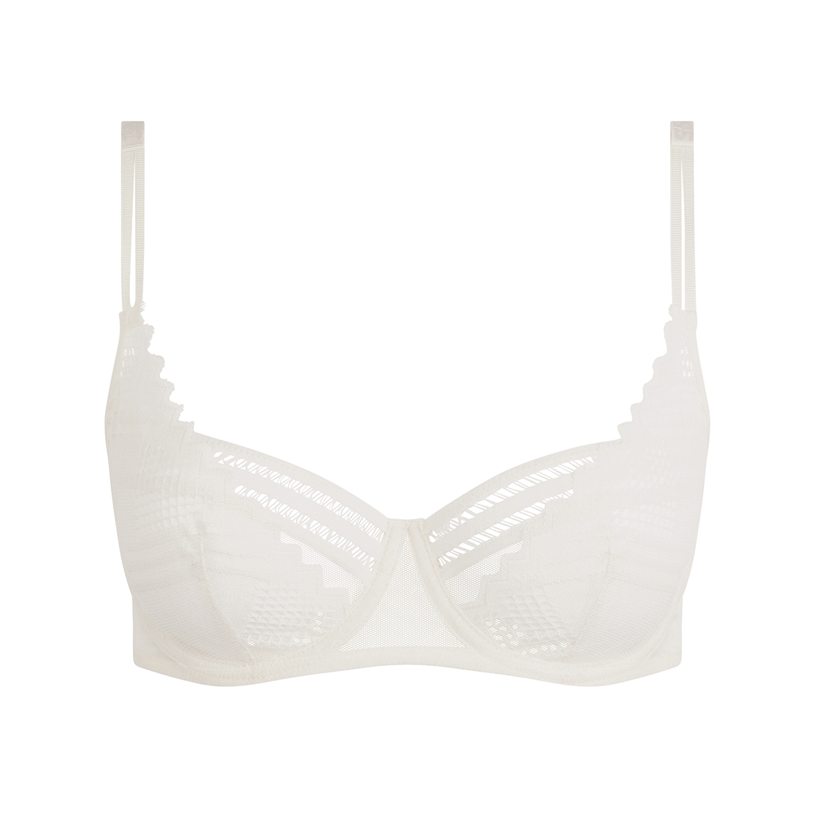 Бюстгальтер - балконет с мягкой формой чашек на косточках. Чашки выполнены из прозрачного тюля и покрыты кружевом с графичным орнаментом. В верхняя часть чашек дополнена мережкой. Широкая основа бюстгальтера выполнена из тюля. Боковые панели также – из тюля. Регулирующиеся бретели. Дублированные чашки для придания необходимой поддержки, начиная с размера С70.