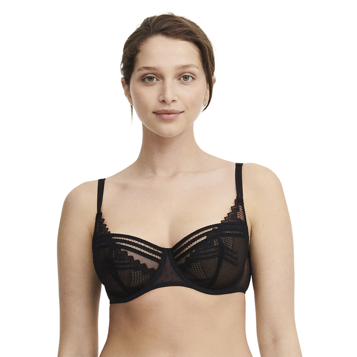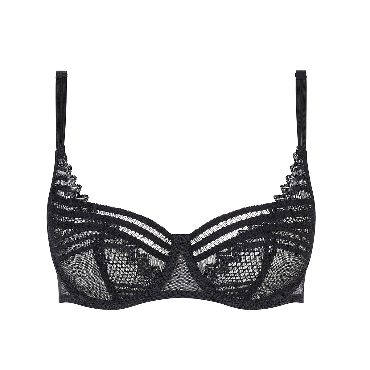 Бюстгальтер - балконет с мягкой формой чашек на косточках. Чашки выполнены из прозрачного тюля и покрыты кружевом с графичным орнаментом. В верхняя часть чашек дополнена мережкой. Широкая основа бюстгальтера выполнена из тюля. Боковые панели также – из тюля. Регулирующиеся бретели. Дублированные чашки для придания необходимой поддержки, начиная с размера С70.