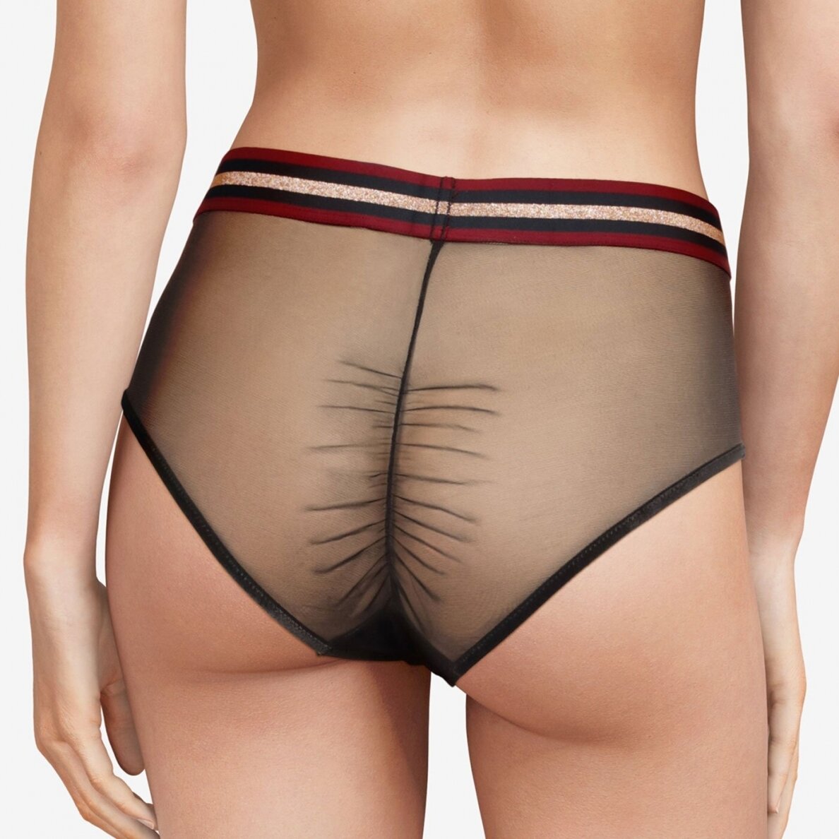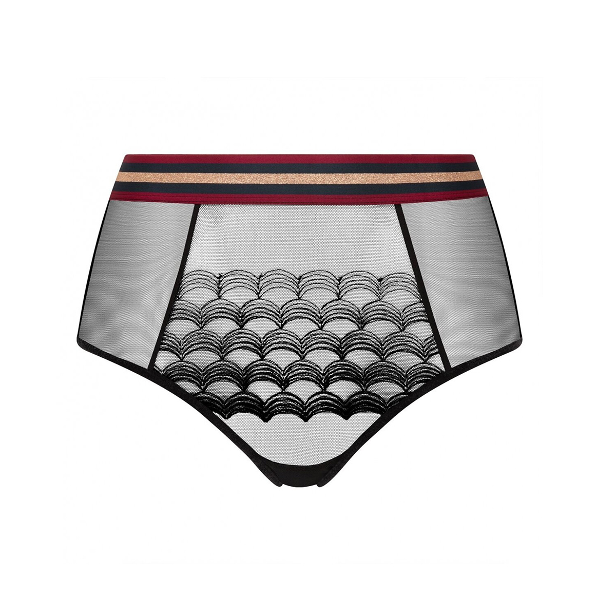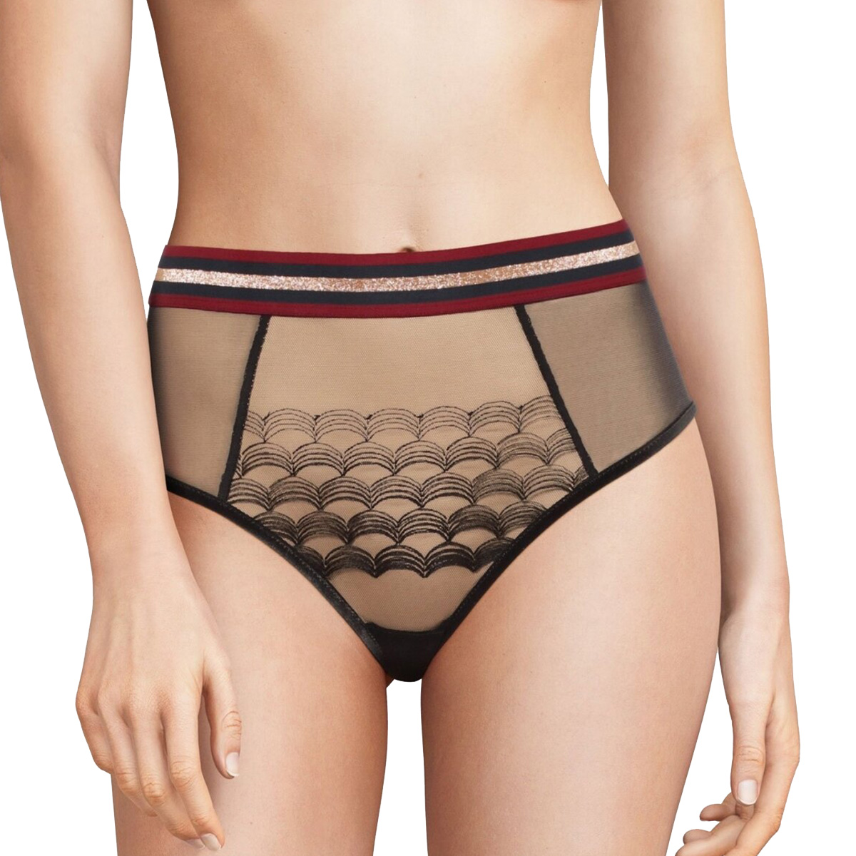 Трусы с высокой талией. Полностью выполнены из прозрачного тюля. Передняя панель декорирована вышивкой. По-верхнему краю - широкий эластичный пояс в спортивном стиле.