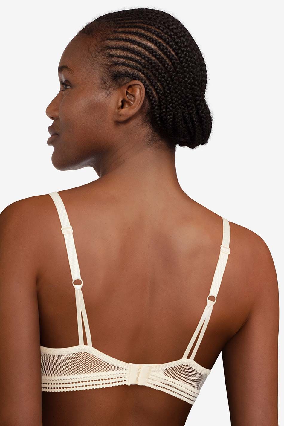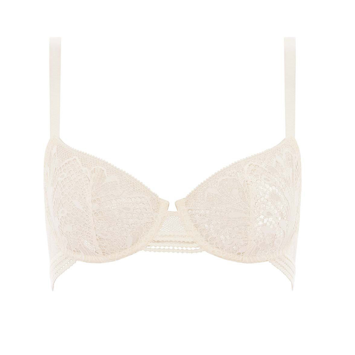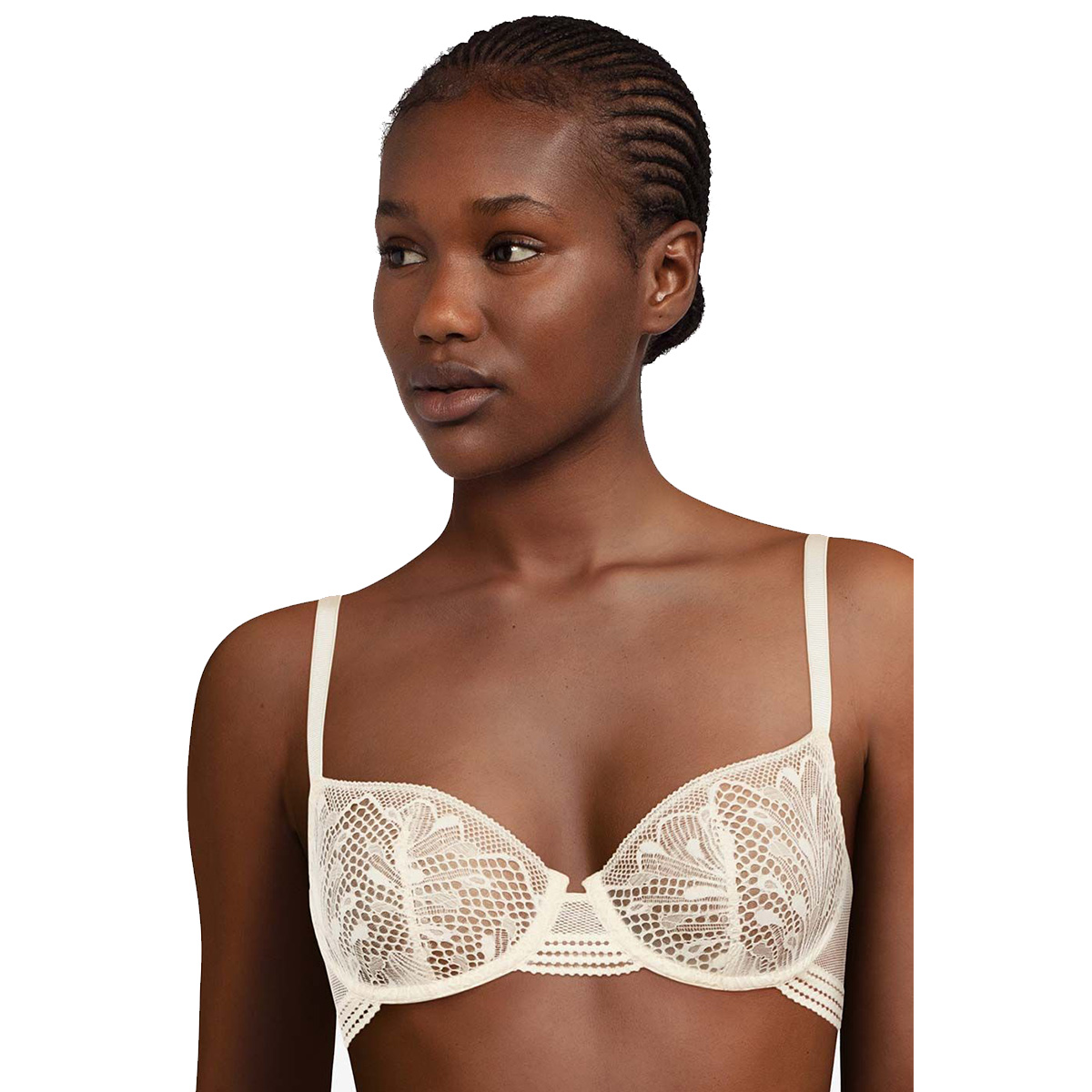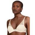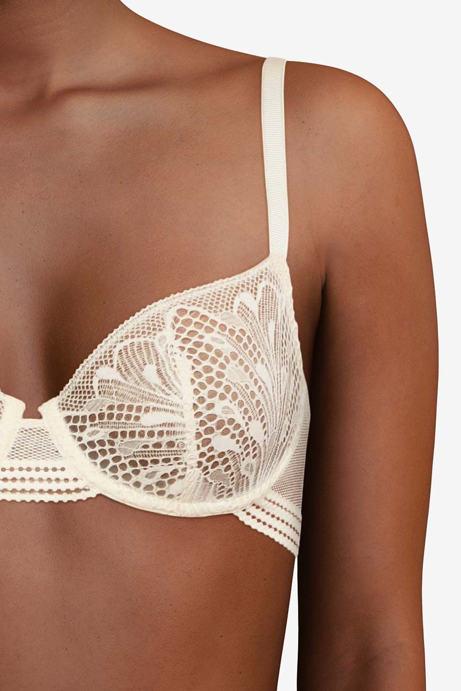 Бюстгальтер - балконет с мягкой достаточно открытой формой чашек на косточках. Чашки выполнены из гипюра с цветочным орнаментом и с внутренней стороны дублированы тюлем. Основа бюстгальтера и боковые панели выполнены из эластичной сетки. Область декольте дополнена декоративными зубчиками. Регулирующиеся бретели.