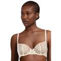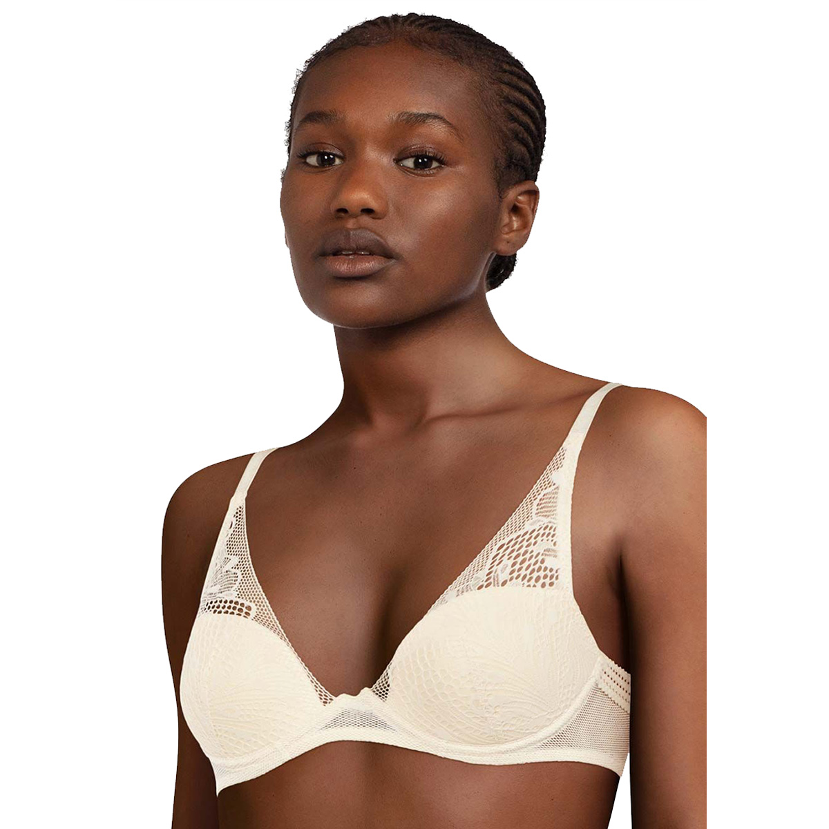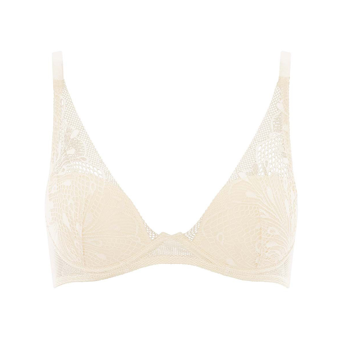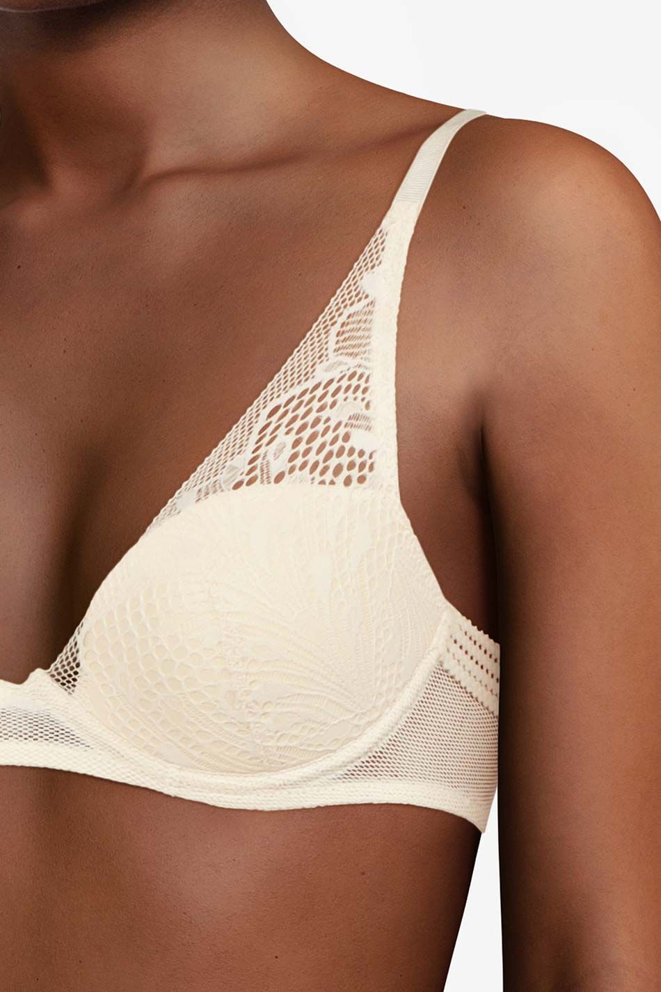 Бюстгальтер - треугольник с мягкой формой чашек на косточках. Чашки оснащены небольшими подушками (для придания визуально дополнительного объема) и покрыты гипюром с цветочным орнаментом. Основа бюстгальтера и боковые панели выполнены из эластичной сетки. Область декольте дополнена декоративными зубчиками. Регулирующиеся бретели.